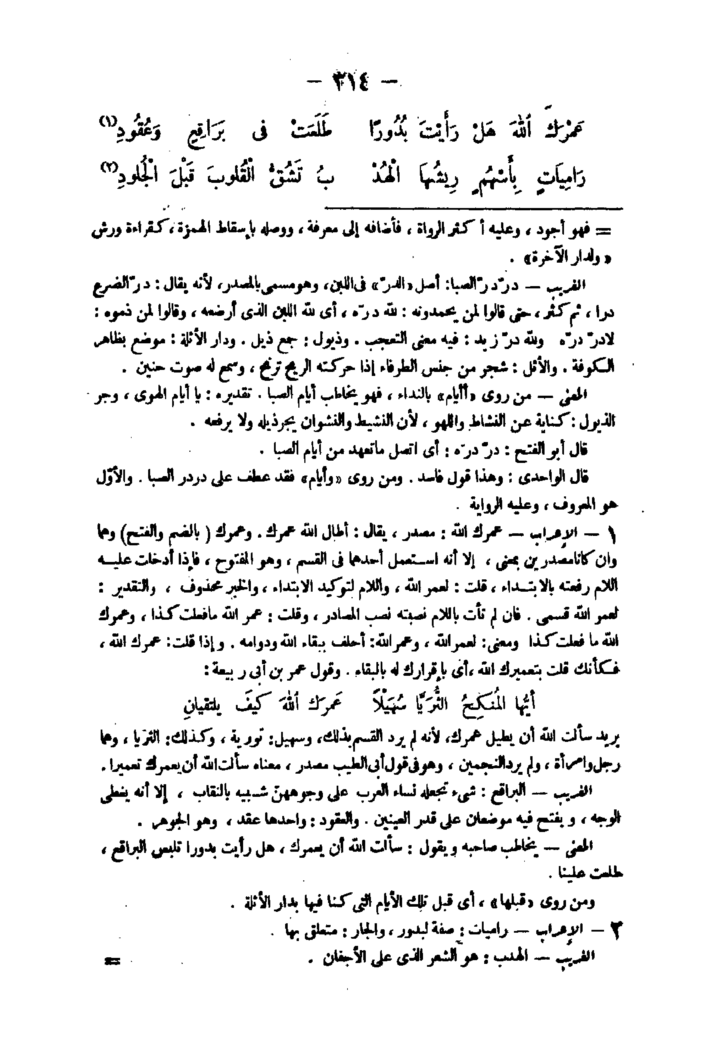 يُرِيد سَأَلت الله أَن يُطِيل عمرك لِأَنَّهُ لم يرد الْقسم بذلك وَسُهيْل تورية وَكَذَلِكَ الثريا وهما رجل وَامْرَأَة وَلم يرد النجمين وَهُوَ فى قَول أَبى الطّيب مصدر مَعْنَاهُ سَأَلت الله أَن يعمرك تعميرا الْغَرِيب البراقع شَيْء تَجْعَلهُ نسَاء الْعَرَب على وجوههن شَبيه بالنقاب إِلَّا أَنه يغطى الْوَجْه وَيفتح فِيهِ موضعان على قدر الْعَينَيْنِ والعقود وَاحِدهَا عقد وَهُوَ الْجَوْهَر الْمَعْنى يُخَاطب صَاحبه وَيَقُول سَأَلت الله أَن يعمرك هَل رَأَيْت بدورا تلبس البراقع طلعت عَلَيْهَا وَمن روى قبلهَا أى قبل تِلْكَ الْأَيَّام الَّتِى كُنَّا فِيهَا بدار الأثلة