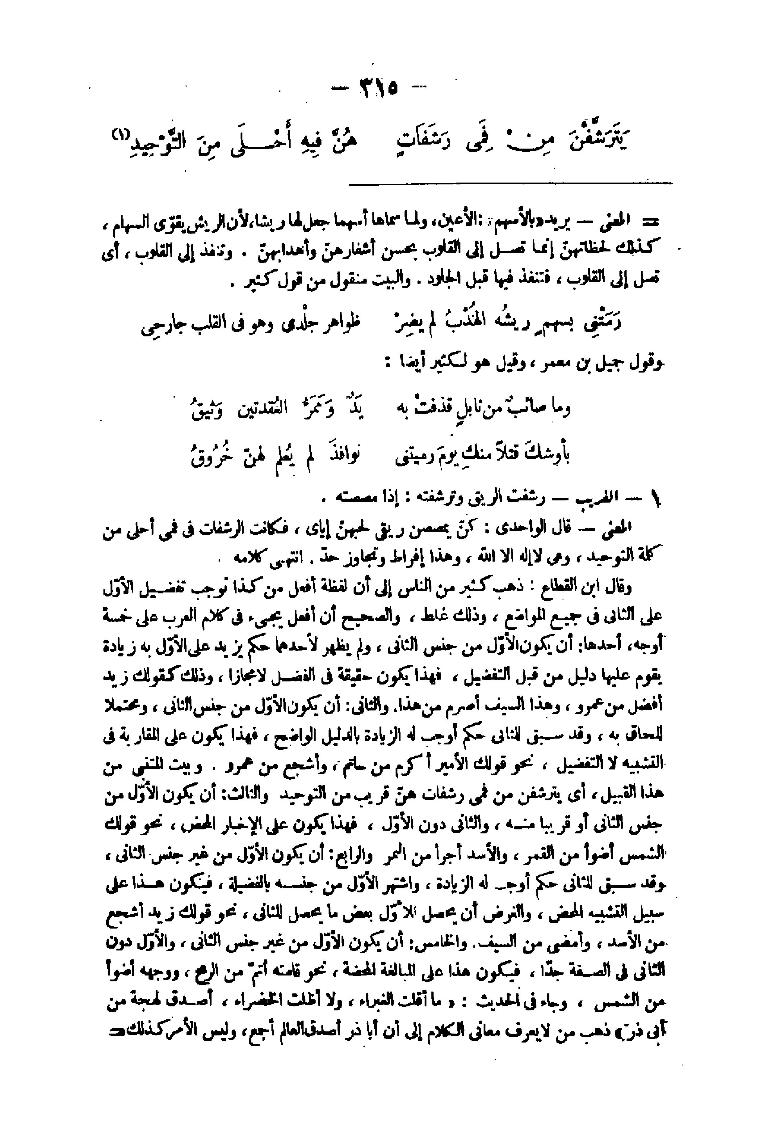 - الْغَرِيب رشفت الرِّيق وترشفته إِذا مصصته الْمَعْنى قَالَ الواحدى كن يمصصن ريقى لحبهن إياى فَكَانَت الرشفات فى فمى أحلى من كلمة التَّوْحِيد وهى لَا إِلَه إِلَّا الله وَهَذَا إفراط وَتجَاوز حد انْتهى كَلَامه وَقَالَ ابْن القطاع ذهب كثير من النَّاس إِلَى أَن لَفْظَة أفعل من كَذَا توجب تَفْضِيل الأول على الثانى فى جَمِيع الْمَوَاضِع وَذَلِكَ غلط وَالصَّحِيح أَن أفعل يجِئ فى كَلَام الْعَرَب على خَمْسَة أوجه أَحدهَا أَن يكون الأول من جنس الثانى وَلم يظْهر لأَحَدهمَا حكم يزِيد على الأول بِهِ زِيَادَة يقوم عَلَيْهَا دَلِيل من قبل التَّفْضِيل فَهَذَا يكون حَقِيقَة فى الْفضل لَا مجَازًا وَذَلِكَ كَقَوْلِك زيد أفضل من عَمْرو وَهَذَا السَّيْف أَصْرَم من هَذَا والثانى أَن يكون الأول من جنس الثانى ومحتملا للحاق بِهِ وَقد سبق للثانى حكم أوجب لَهُ الزِّيَادَة بِالدَّلِيلِ الْوَاضِح فَهَذَا يكون على المقاربة فى التَّشْبِيه لَا التَّفْضِيل نَحْو قَوْلك الْأَمِير أكْرم من حَاتِم وَأَشْجَع من عَمْرو وَبَيت المتنبى من هَذَا الْقَبِيل أى يترشفن من فمى رشفات هن قريب من التَّوْحِيد وَالثَّالِث أَن يكون الأول من جنس الثانى أَو قَرِيبا مِنْهُ والثانى دون الأول فَهَذَا يكون على الْإِخْبَار الْمَحْض نَحْو قَوْلك الشَّمْس أَضْوَأ من الْقَمَر والأسد أجرأ من النمر وَالرَّابِع أَن يكون الأول من غير جنس الثانى وَقد سبق للثانى حكم أوجد لَهُ الزِّيَادَة واشتهر للْأولِ من جنسه بالفضيلة فَيكون هَذَا على سَبِيل التَّشْبِيه الْمَحْض وَالْغَرَض أَن يحصل للْأولِ بعض مَا يحصل للثانى نَحْو قَوْلك زيد أَشْجَع من الْأسد وأمضى من السَّيْف وَالْخَامِس أَن يكون الأول من غير جنس الثانى وَالْأول دون الثانى فى الصّفة جدا فَيكون هَذَا على الْمُبَالغَة الْمَحْضَة نَحْو قامته أتم من الرمْح وَوَجهه أَضْوَأ من الشَّمْس وَجَاء فى الحَدِيث " مَا أقلت الغبراء وَلَا أظلت الخضراء أصدق لهجة من أَبى ذَر " ذهب من لَا يعرف معانى الْكَلَام إِلَى أَن أَبَا ذَر أصدق الْعَالم أجمع وَلَيْسَ الْأَمر كَذَلِك وَإِنَّمَا نفى عَلَيْهِ الصَّلَاة وَالسَّلَام أَن يكون أحد أَعلَى مِنْهُ رُتْبَة فى الصدْق وَلم ينف أَن يكون فى النَّاس مثله فى الصدْق وَلَو أَرَادَ مَا ذَهَبُوا إِلَيْهِ لقَالَ أَبُو ذَر أصدق من كل من أظلت وأقلت وروى الْأَكْثَر أحلى من التَّوْحِيد وَمن روى حلاوة التَّوْحِيد أَرَادَ هى عندى مثل حلاوة التَّوْحِيد فَحذف الْمُضَاف وَرفع قَالَ أَبُو الْفَتْح يرْوى أَنه أنْشدهُ حلاوة التَّوْحِيد