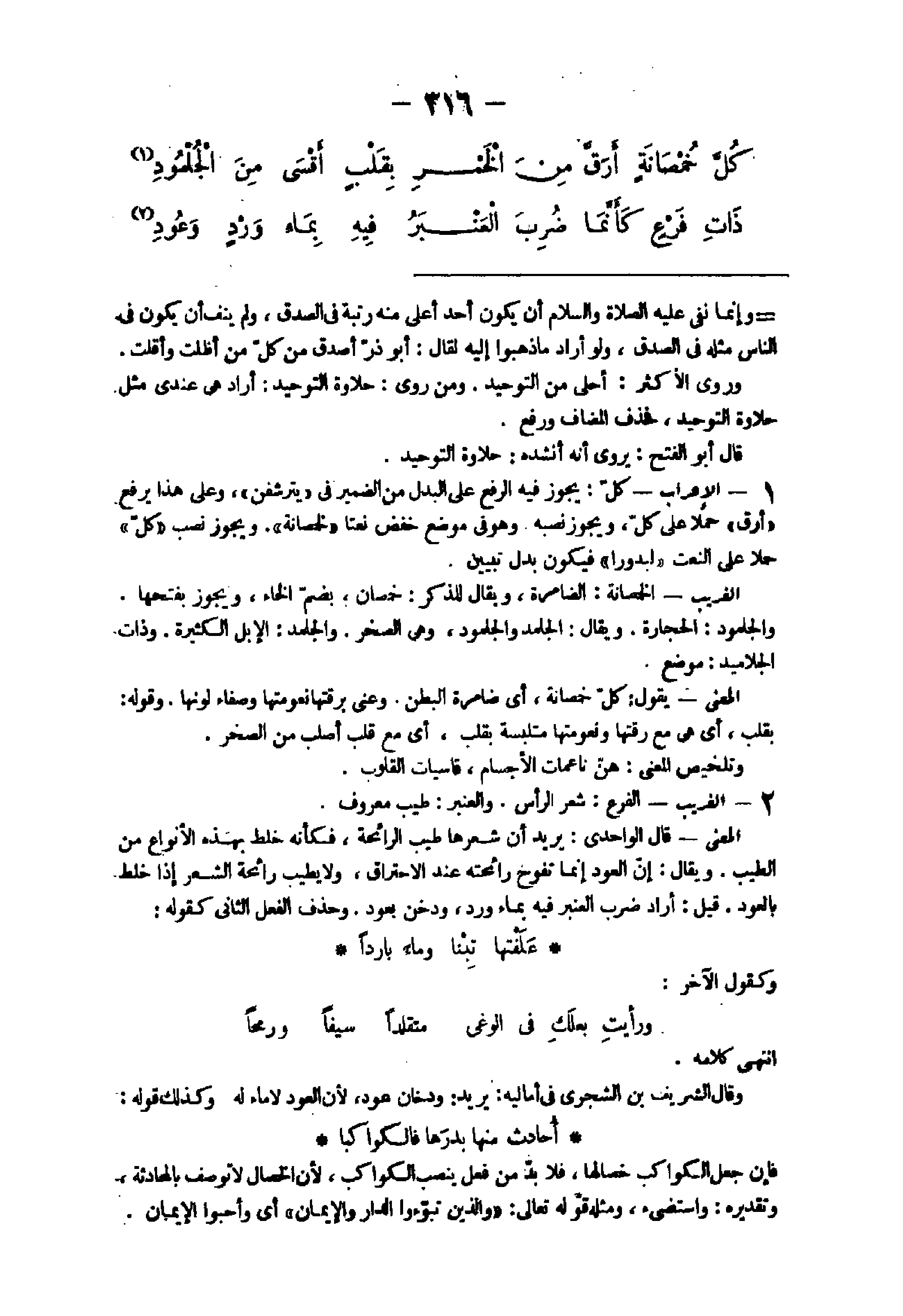 - الْإِعْرَاب كل يجوز فِيهِ الرّفْع على الْبَدَل من الضَّمِير فى يترشفن وعَلى هَذَا يرفع أرق حملا على كل وَيجوز نَصبه وَهُوَ فى مَوضِع خفض نعتا الخمصانة وَيجوز نصب كل حملا على النَّعْت لبدورا فَيكون بدل تَبْيِين الْغَرِيب الخمصانة الضامرة وَيُقَال للذّكر خمصان بِضَم الْخَاء وَيجوز بِفَتْحِهَا والجلمود الْحِجَارَة وَيُقَال الجلمد والجلمود وهى الصخر والجلمد الْإِبِل الْكَثِيرَة وَذَات الجلاميد مَوضِع الْمَعْنى يَقُول كل خمصانة أى ضامرة الْبَطن وعنى برقتها نعومتها وصفاء لَوْنهَا وَقَوله بقلب أى هى مَعَ رقتها ونعومتها متلبسة بقلب أى مَعَ قلب أَصْلَب من الصخر وتلخيص الْمَعْنى هن ناعمات الْأَجْسَام قاسيات الْقُلُوب