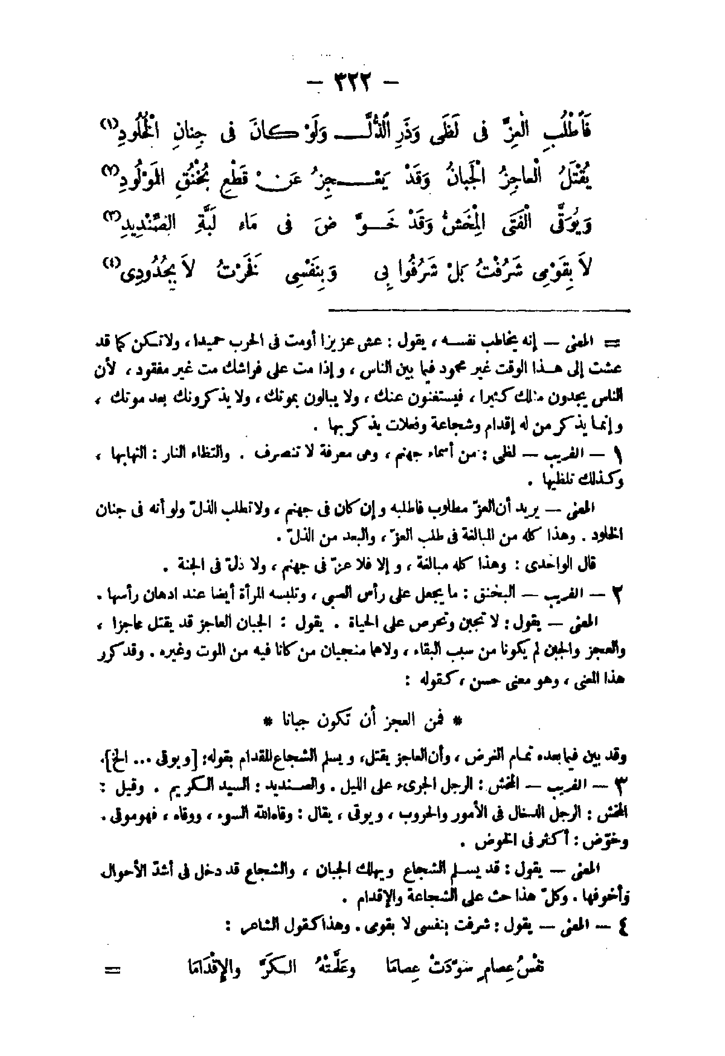 31 - الْغَرِيب المخش الرجل الجرئ على اللَّيْل والصنديد السَّيِّد الْكَرِيم وَقيل المخش الرجل الدخال فى الْأُمُور وَالْحَرب ويوقى يُقَال وَقَاه الله السوء ووقاه فَهُوَ مرقى وخوض أَكثر فى الْخَوْض الْمَعْنى يَقُول قد يسلم الشجاع وَيهْلك الجبان والشجاع قد دخل فى أَشد الْأَحْوَال وأخوفها وكل هَذَا حث على الشجَاعَة والإقدام