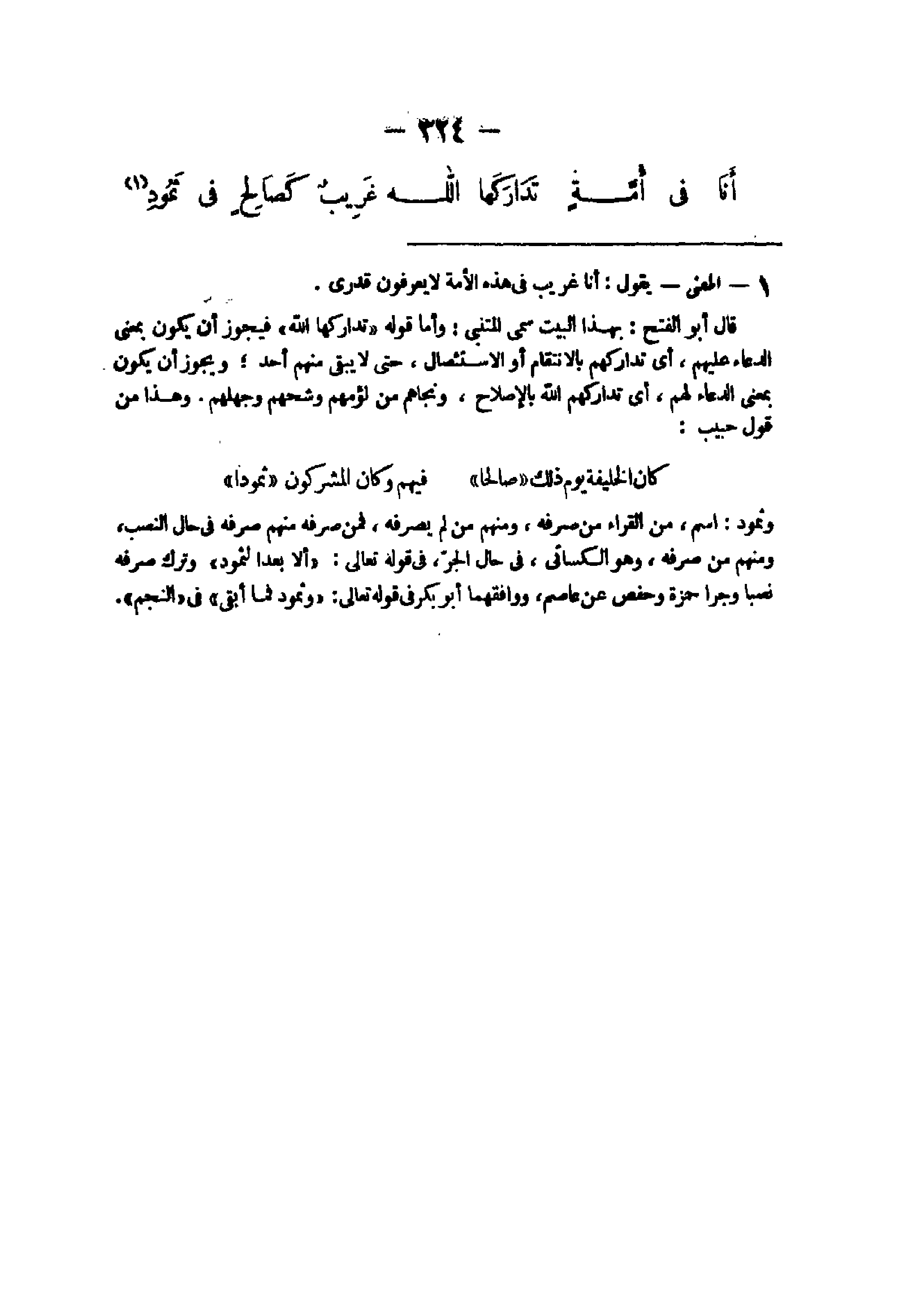 - الْمَعْنى يَقُول أَنا غَرِيب فى هَذِه الْأمة لَا يعْرفُونَ قدرى قَالَ أَبُو الْفَتْح بِهَذَا الْبَيْت سمى المتنبى وَأما قَوْله {تداركها الله} فَيجوز أَن يكون بِمَعْنى الدُّعَاء عَلَيْهِم أى تداركهم بالانتقام أَو الاستئصال حَتَّى لَا يبْقى مِنْهُم أحد وَيجوز أَن يكون بِمَعْنى الدُّعَاء لَهُم أى تداركهم الله بالإصلاح ونجاهم من لؤمهم وشحهم وجهلهم وَهَذَا من قَول حبيب