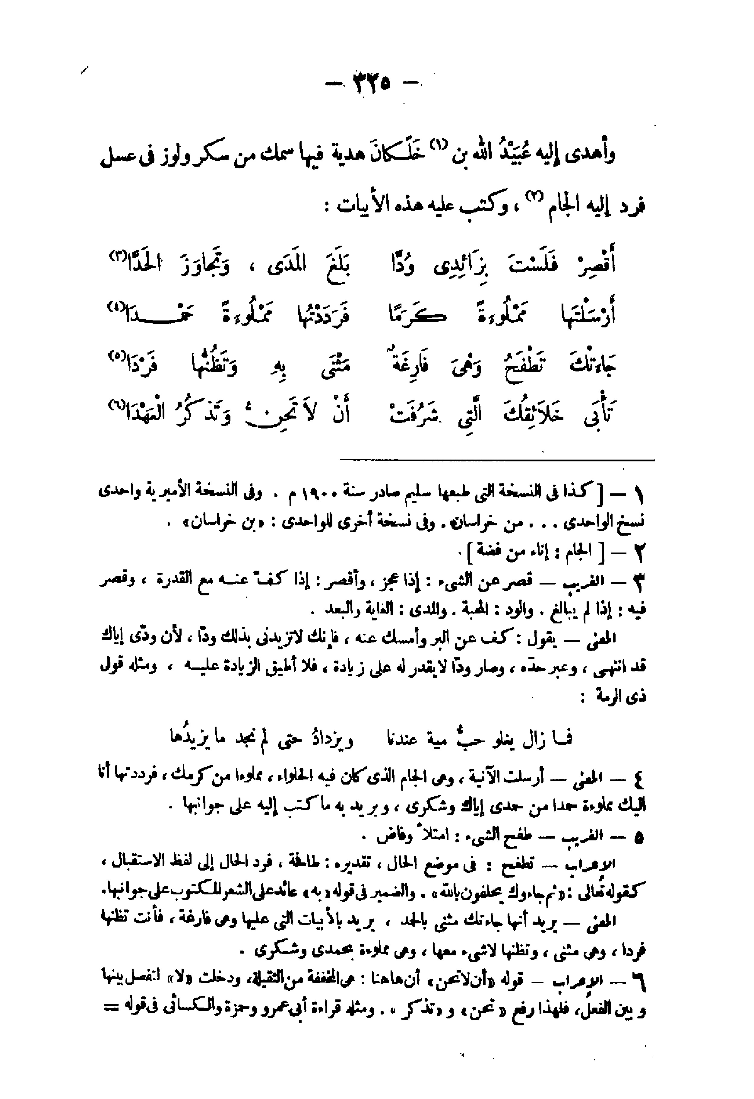 الْمَعْنى أرْسلت الْآنِية وهى الْجَام الذى كَانَ فِيهِ الْحَلْوَاء مملوءا من كرمك فرددتها أَنا إِلَيْك مَمْلُوءَة حمدا من حمدى إياك وشكرى وَيُرِيد بِهِ مَا كتب إِلَيْهِ على جوانبها 3 - الْغَرِيب طفح الشَّيْء امْتَلَأَ وفاض الْإِعْرَاب تطفح من مَوضِع الْحَال تَقْدِيره طافحة فَرد الْحَال إِلَى الِاسْتِقْبَال كَقَوْلِه تَعَالَى ثمَّ جاءوك يحلفُونَ بِاللَّه وَالضَّمِير فِي قَوْله بِهِ عَائِد على الشّعْر الْمَكْتُوب على جوانبها الْمَعْنى يُرِيد أَن جاءتك مثنى بِالْحَمْد يُرِيد بالأبيات الَّتِى عَلَيْهَا وهى فارغة فَأَنت تظنها فَردا وهى مثنى وتظنها لَا شئ مَعهَا وهى مَمْلُوءَة بحمدى وشكرى