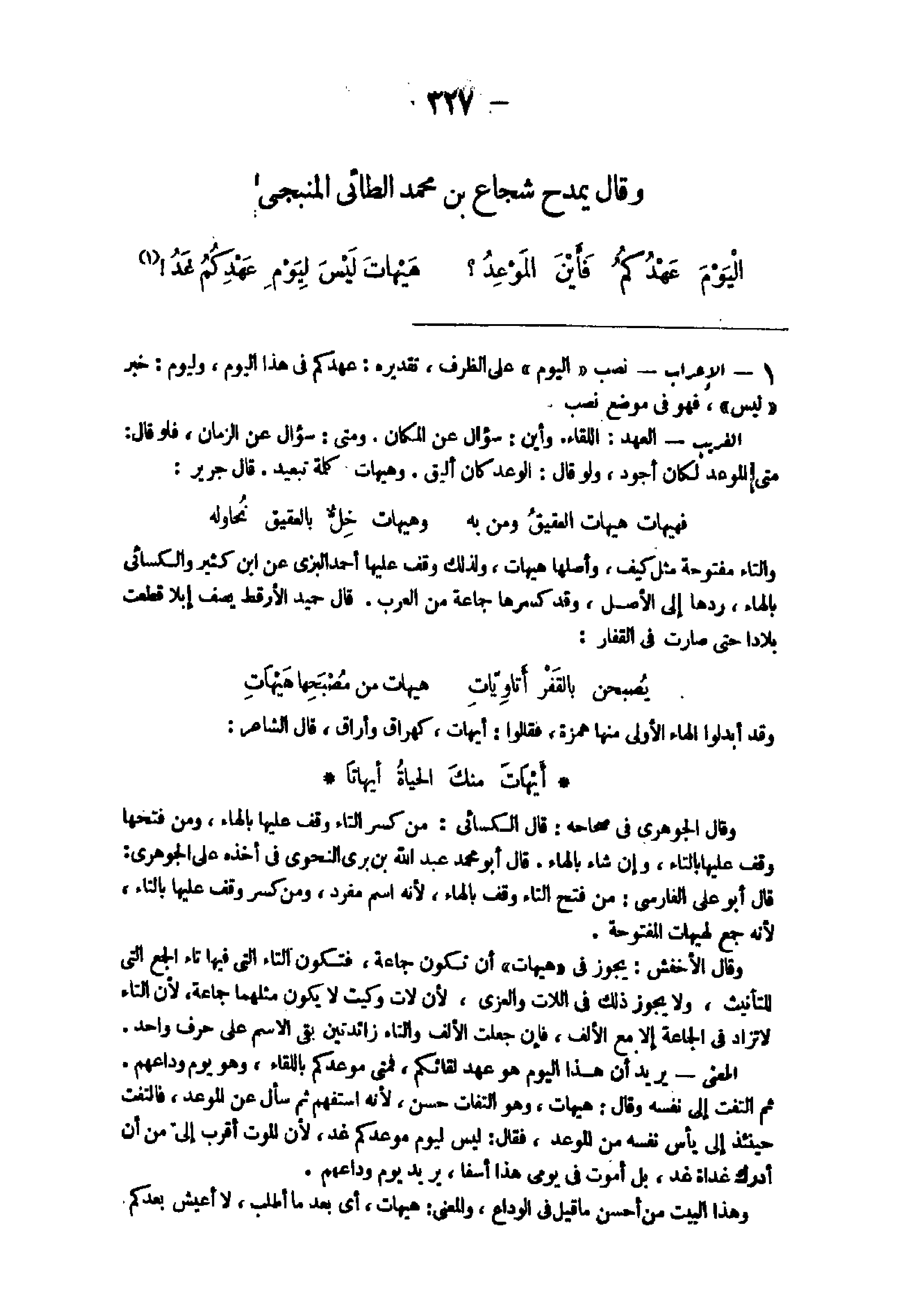 - 1 - الْإِعْرَاب نصب الْيَوْم على الظّرْف تَقْدِيره عهدكم فى هَذَا الْيَوْم وَالْيَوْم خبر لَيْسَ فَهُوَ فى مَوضِع نصب الْغَرِيب الْعَهْد اللِّقَاء وَأَيْنَ سُؤال عَن الْمَكَان وَمَتى سُؤال عَن الزَّمَان فَلَو قَالَ مَتى الْموعد لَكَانَ أَجود وَلَو قَالَ الْوَعْد كَانَ أليق وهيهات كلمة تبعيد قَالَ جرير