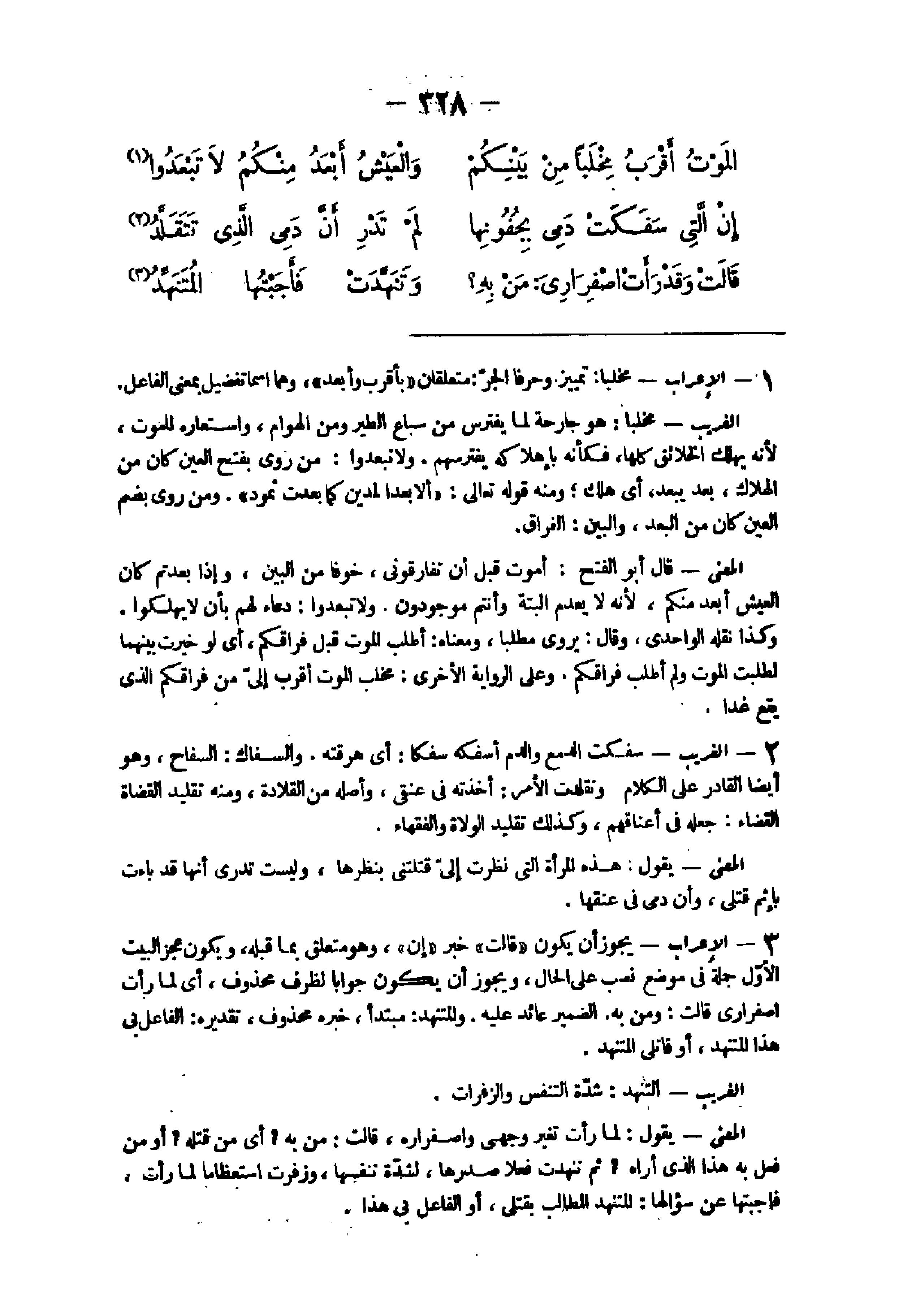 - الْإِعْرَاب مخلبا تَمْيِيز وحرفا الْجَرّ متعلقان بأقرب وَأبْعد وهما اسْما تَفْضِيل بِمَعْنى الْفَاعِل الْغَرِيب مخلبا هُوَ جارحة لما يفترس من سِبَاع الطير وَمن الْهَوَام واستعاره للْمَوْت لِأَنَّهُ يهْلك الْخَلَائق كلهَا فَكَأَنَّهُ بإهلاكه يفترسهم وَلَا تبعدوا من روى بِفَتْح الْعين كَانَ من الْهَلَاك بعد يبعد أى هلك وَمِنْه قَوْله تَعَالَى {أَلا بعدا لمدين كَمَا بَعدت ثَمُود} وَمن روى بِضَم الْعين كَانَ من الْبعد والبين الْفِرَاق الْمَعْنى قَالَ أَبُو الْفَتْح أَمُوت قبل أَن تفارقونى خوفًا من الْبَين وَإِذا بعدتم كَانَ الْعَيْش أبعد مِنْكُم لِأَنَّهُ لَا يعْدم الْبَتَّةَ وَأَنْتُم موجودون وَلَا تبعدوا دُعَاء لَهُم بِأَن لَا يهْلكُوا وَكَذَا نَقله الواحدى وَقَالَ يرْوى مطلبا وَمَعْنَاهُ أطلب الْمَوْت قبل فراقكم أى لَو خيرت بَينهمَا لطلبت الْمَوْت وَلم أطلب فراقكم وعَلى الرِّوَايَة الْأُخْرَى مخلب الْمَوْت أقرب إِلَى من فراقكم الذى يَقع غَدا