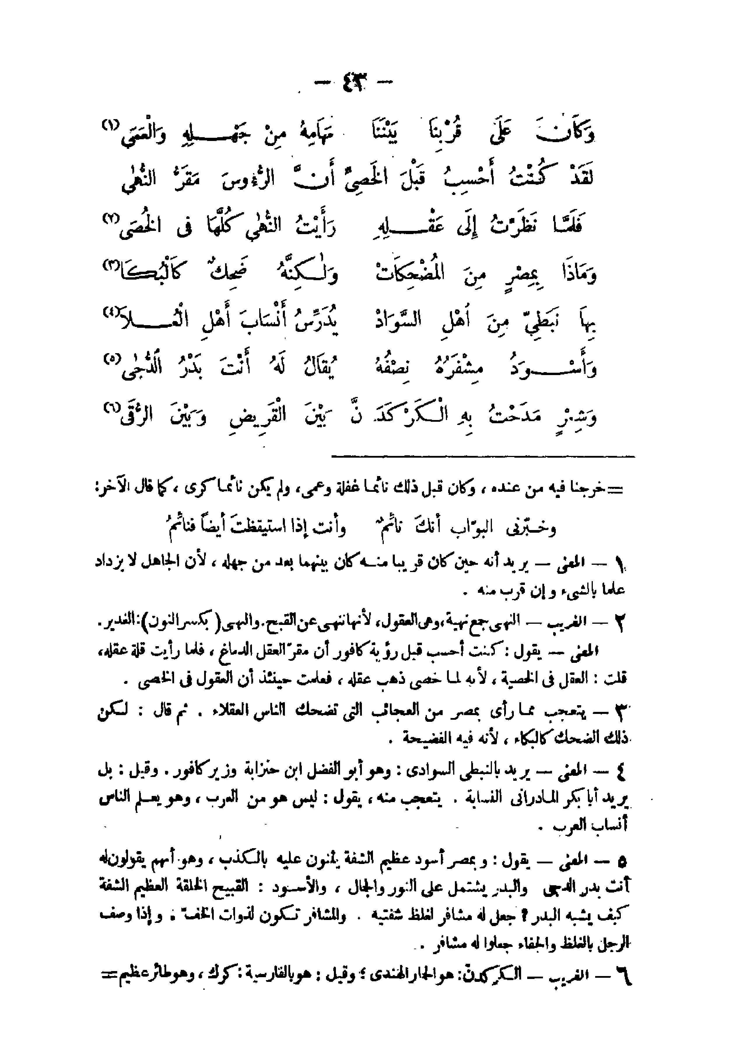 31 - الْمَعْنى يَقُول وبمصر أسود عَظِيم الشّفة يشنون عَلَيْهِ بِالْكَذِبِ وَهُوَ أَنهم يَقُولُونَ لَهُ أَنْت بدر الدجى والبدر يشْتَمل على النُّور وَالْجمال وَالْأسود الْقَبِيح الْخلقَة الْعَظِيم الشّفة كَيفَ يشبه الْبَدْر جعل لَهُ مشافر لغلظ شَفَتَيْه والمشافر تكون لذوات الْخُف وَإِذا وصف الرجل بالغلظ والجفاء جعلُوا لَهُ مشافر