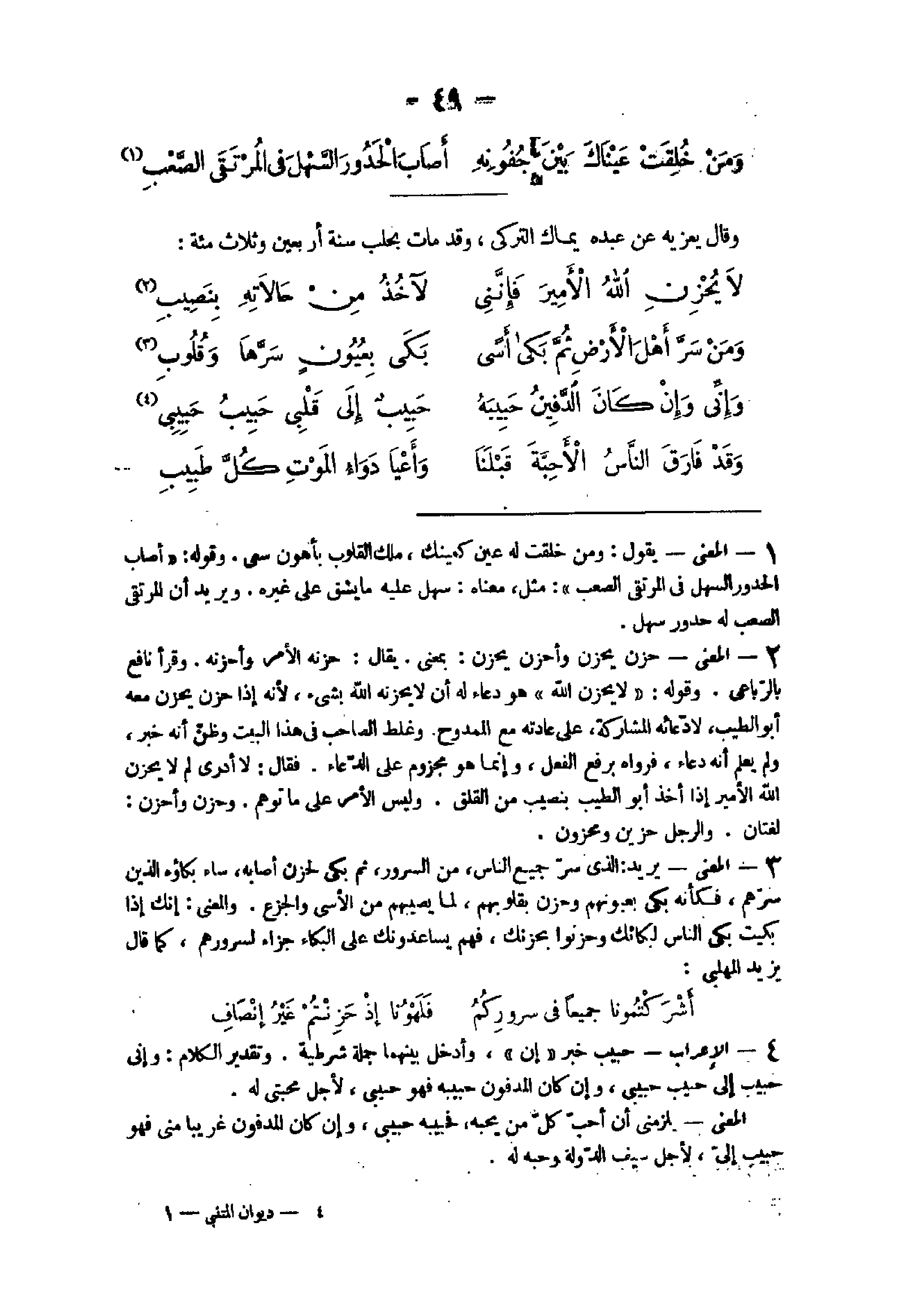 3 - الْإِعْرَاب حبيب خبر إِن وَأدْخل بَينهمَا جملَة شَرْطِيَّة وَتَقْدِير الْكَلَام وإنى حبيب إِلَى حبيب حبيبى وَإِن كَانَ المدفون حَبِيبه فَهُوَ حبيبى لأجل محبتى لَهُ الْمَعْنى يلزمنى أَن أحب كل من يُحِبهُ فحبيبه حبيبى وَإِن كَانَ المدفون غَرِيبا منى فَهُوَ حبيب إِلَى لأجل سيف الدولة وحبه لَهُ