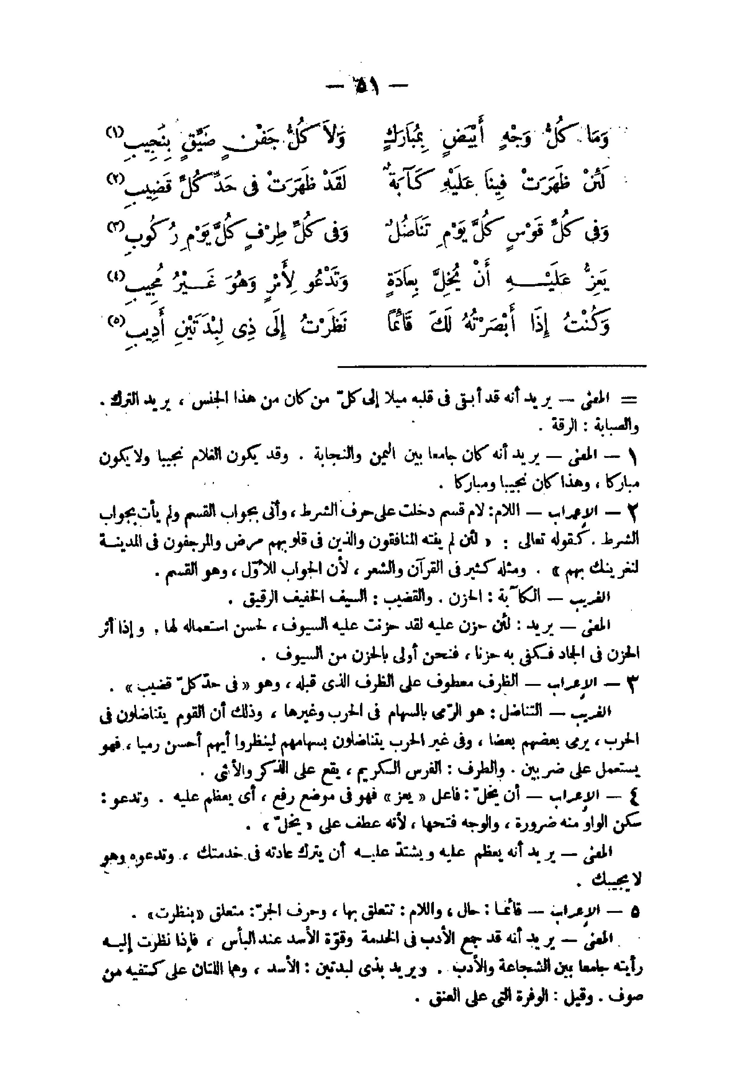 11 - الْإِعْرَاب اللَّام لَام قسم دخلت على حرف الشَّرْط وأنى بِجَوَاب الْقسم وَلم يَأْتِ بِجَوَاب الشَّرْط كَقَوْلِه تَعَالَى {لَئِن لم ينْتَه المُنَافِقُونَ وَالَّذين فى قُلُوبهم مرض والمرجفون فى الْمَدِينَة لنغرينك بهم} وَمثله كثير فى الْقُرْآن وَالشعر لِأَن الْجَواب للْأولِ وَهُوَ الْقسم الْغَرِيب الكآبة الْحزن والقضيب السَّيْف الْخَفِيف الرَّقِيق الْمَعْنى يُرِيد لَئِن حزن عَلَيْهِ لقد حزنت عَلَيْهِ السيوف لحسن اسْتِعْمَاله لَهَا وَإِذا أثر الْحزن فى الجماد فَكفى بِهِ حزنا فَنحْن أولى بالحزن من السيوف