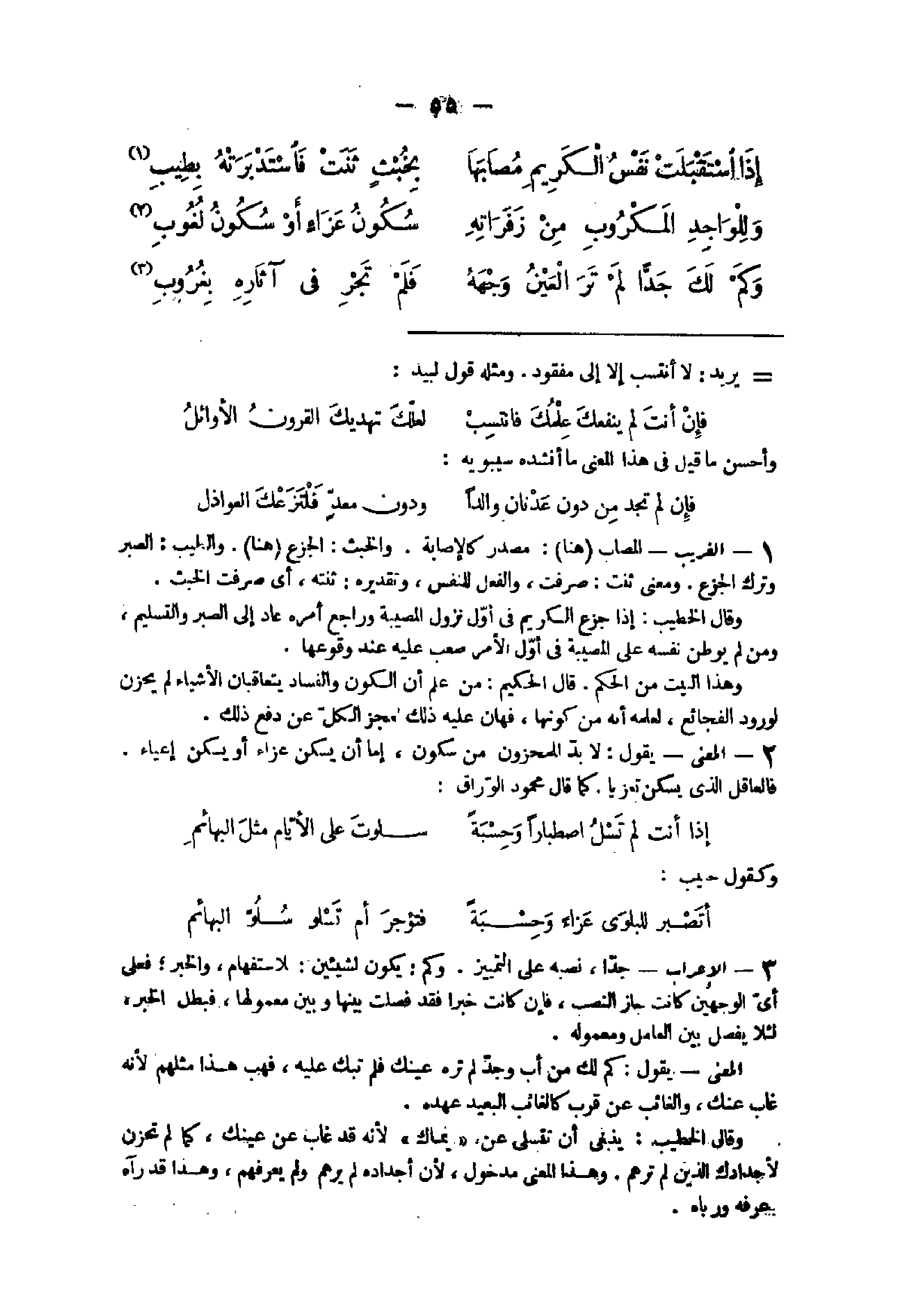 - الْغَرِيب الْمُصَاب هُنَا مصدر كالإصابة والخبث الْجزع هُنَا وَالطّيب الصَّبْر وَترك الْجزع وَمعنى ثنت صرفت وَالْفِعْل للنَّفس وَتَقْدِيره ثنته أى صرفت الْخبث وَقَالَ الْخَطِيب إِذا جزع الْكَرِيم فى أول نزُول الْمُصِيبَة وراجع أمره عَاد إِلَى الصَّبْر وَالتَّسْلِيم وَمن لم يوطن نَفسه على الْمُصِيبَة فى أول الْأَمر صَعب عَلَيْهِ عِنْد وُقُوعهَا وَهَذَا الْبَيْت من الحكم قَالَ الْحَكِيم من علم أَن الْكَوْن وَالْفساد يتعاقبان الْأَشْيَاء لم يحزن لوُرُود الفجائع لعلمه أَنه من كَونهَا فهان عَلَيْهِ ذَلِك لعجز الْكل عَن دفع ذَلِك
