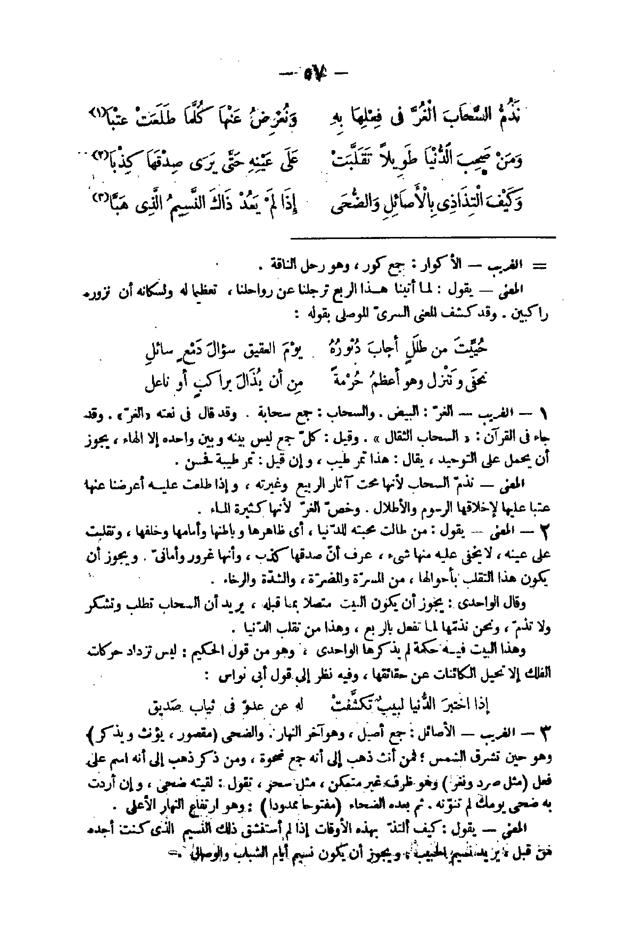 - الْغَرِيب الغر الْبيض والسحاب جمع سَحَابَة وَقد قَالَ فى نَعته الغر وَقد جَاءَ فى الْقُرْآن السَّحَاب الثقال وَقيل كل جمع لَيْسَ بَينه وَبَين واحده إِلَّا الْهَاء يجوز أَن يحمل على التَّوْحِيد يُقَال هَذَا تمر طيب وَإِن قيل ثَمَر طيبَة فَحسن الْمَعْنى نذم السَّحَاب لِأَنَّهَا محت آثَار الرّبيع وغيرته وَإِذا طلعت عَلَيْهِ أعرضنا عَنْهَا عتبا عَلَيْهَا لإخلاقها الرسوم والأطلال وَخص الغر لِأَنَّهَا كَثِيرَة المَاء