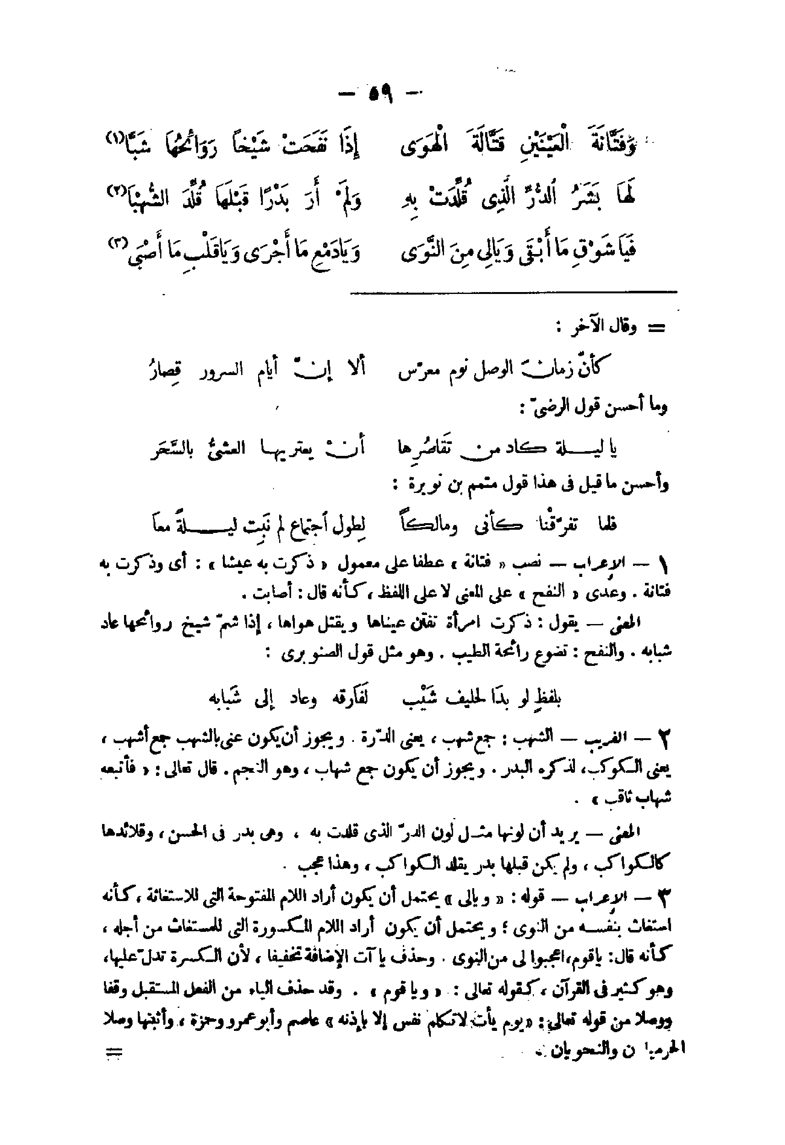 10 - الْإِعْرَاب قَوْله ويالى يحْتَمل أَن يكون أَرَادَ اللَّام الْمَفْتُوحَة الَّتِى للاستغاثة كَأَنَّهُ اسْتَغَاثَ بِنَفسِهِ من النَّوَى وَيحْتَمل أَن يكون أَرَادَ اللَّام الْمَكْسُورَة الَّتِى للمستغاث من أَجله كَأَنَّهُ قَالَ يَا قوم اعجبوا لى من النَّوَى وَحذف ياءات الْإِضَافَة تَخْفِيفًا لِأَن الكسرة تدل عَلَيْهَا وَهُوَ كثير فِي الْقُرْآن كَقَوْلِه تَعَالَى {وَيَا قوم} وَقد حذف الْيَاء من الْفِعْل الْمُسْتَقْبل وَقفا ووصلا من قَوْله تَعَالَى {يَوْم يَأْتِ لَا تكلم نفس إِلَّا بِإِذْنِهِ} عَاصِم وَأَبُو عَمْرو وَحَمْزَة وأثبتها وصلا الحرميان والنحويان الْمَعْنى يُرِيد يَا شوقى مَا أبقاك فَلَا تنفذ ويالى من النَّوَى استغاثة كَأَنَّهُ يَقُول يَا من لى يمنعنى من ظلم الْفِرَاق وَيَا دمعى مَا أجراك وَيَا قلبى مَا أصباك وَحذف الْكَاف المنصوبة للمخاطبة بالنداء // وَهَذَا كُله تعجب //