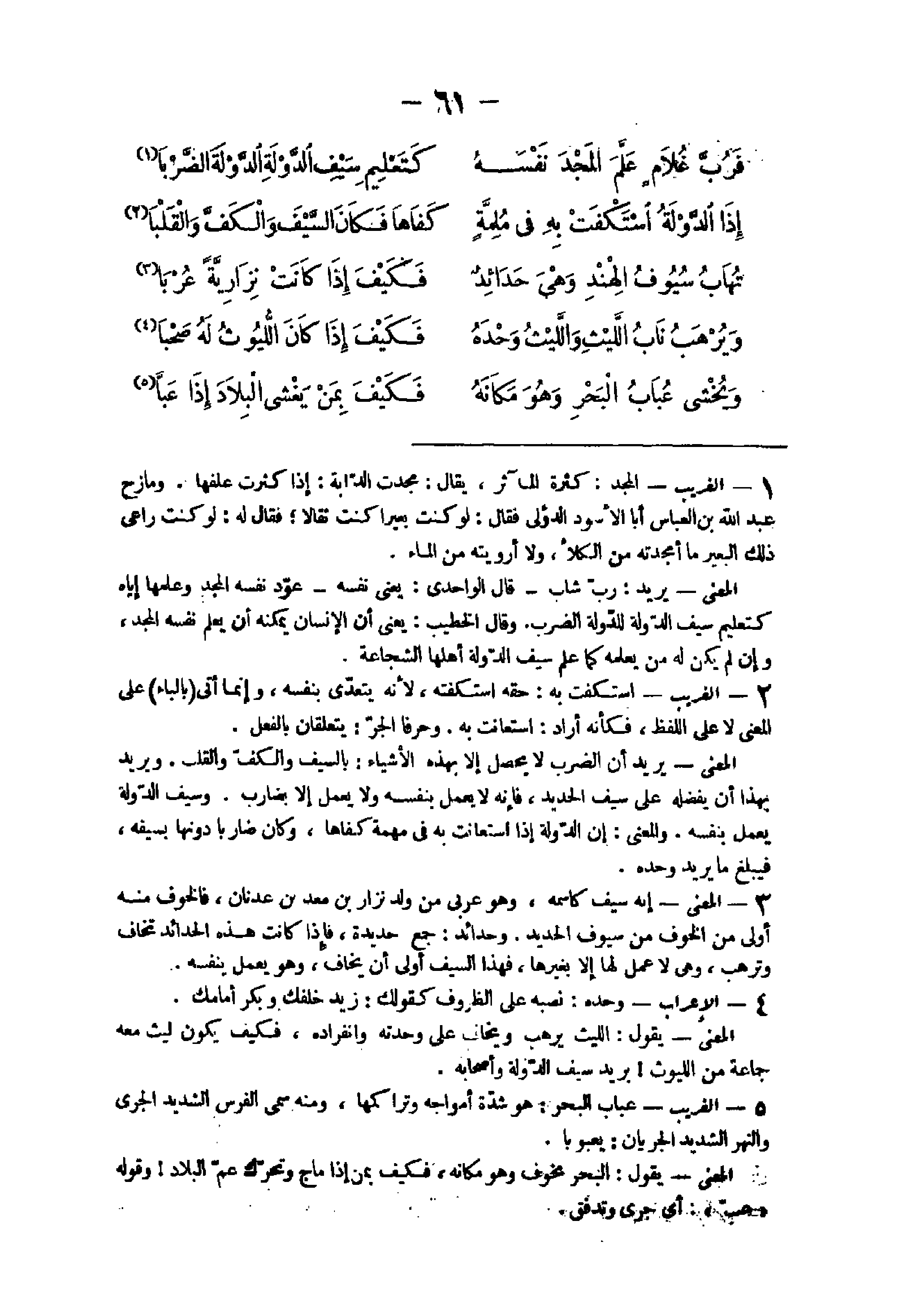 - الْغَرِيب الْمجد كَثْرَة المآثر يُقَال مجدت الدَّابَّة إِذا كثرت عَلفهَا ومازح عبد الله بن الْعَبَّاس أَبَا الْأسود الدؤلى فَقَالَ لَو كنت بَعِيرًا كنت ثقالا فَقَالَ لَهُ لَو كنت رَاعى ذَلِك الْبَعِير مَا أمجدته من الْكلأ وَلَا أرويته من المَاء الْمَعْنى يُرِيد رب شَاب قَالَ الواحدى يعْنى نَفسه عود نَفسه الْمجد وَعلمهَا إِيَّاه كتعليم سيف الدولة للدولة الضَّرْب وَقَالَ الْخَطِيب يعْنى أَن الْإِنْسَان يُمكنهُ أَن يعلم نَفسه الْمجد وَإِن لم يكن لَهُ من يُعلمهُ كَمَا علم سيف الدولة أَهلهَا الشجَاعَة
