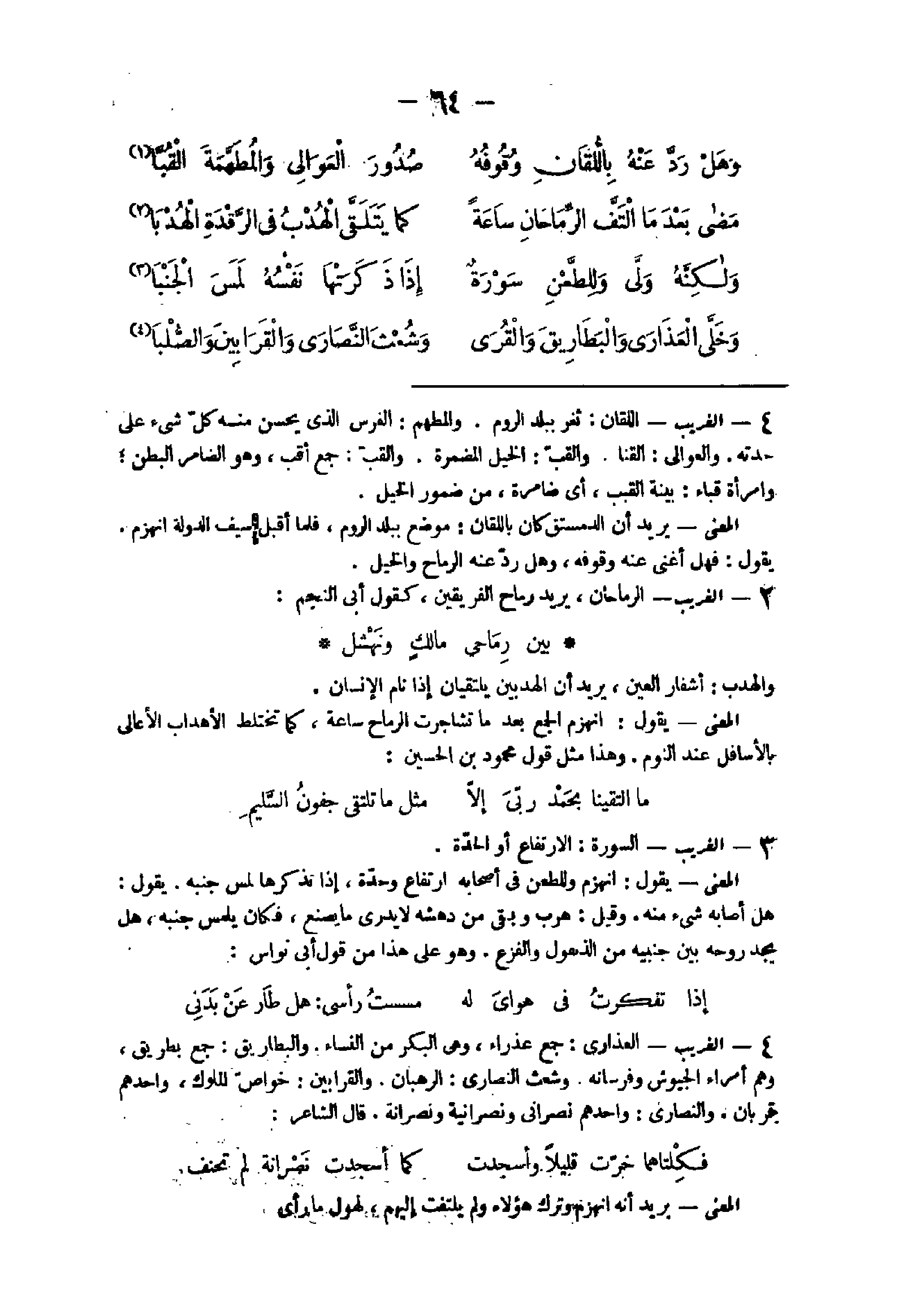 31 - الْغَرِيب العذارى جمع عذراء وهى الْبكر من النِّسَاء والبطاريق جمع بطرِيق وهم أُمَرَاء الجيوش وفرسانه وشعث النَّصَارَى الرهبان والقرابين خَواص الْمُلُوك واحدهم قرْبَان وَالنَّصَارَى واحدهم نصرانى ونصرانية ونصرانة قَالَ الشَّاعِر