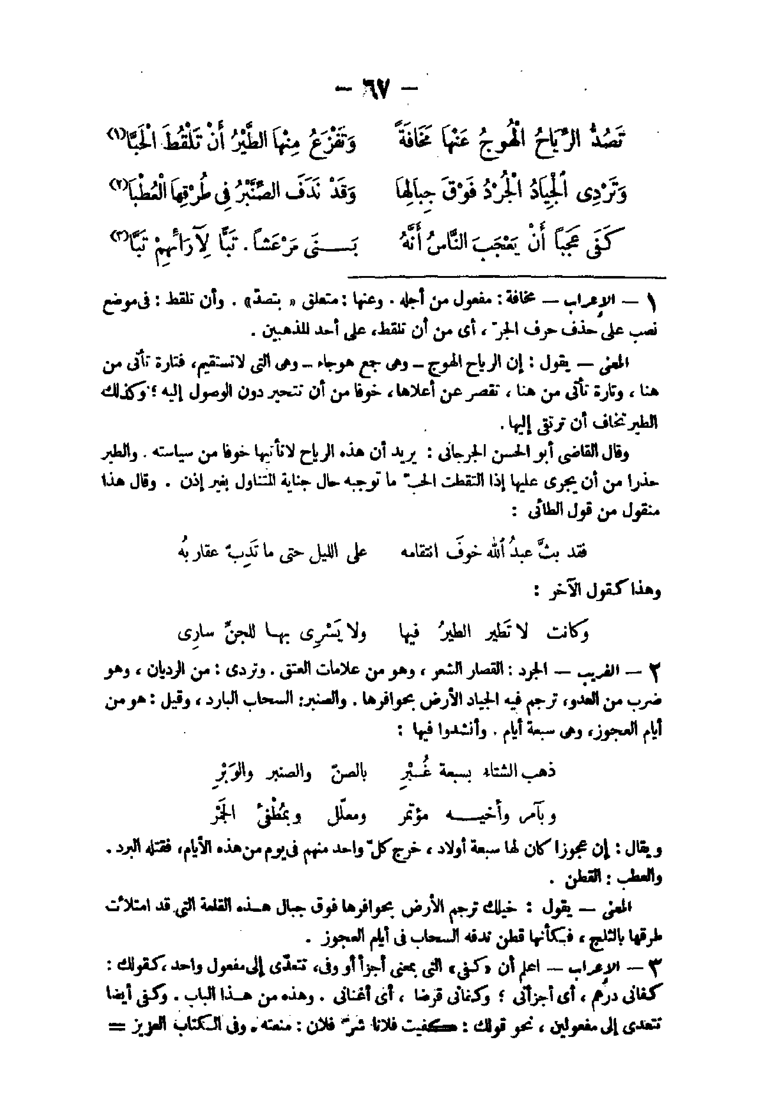 - الْإِعْرَاب مَخَافَة مفعول من أَجله وعنها مُتَعَلق بتصد وَأَن تلقط فى مَوضِع نصب على حذف حرف الْجَرّ أى من أَن تلقط على أحد المذهبين الْمَعْنى يَقُول إِن الرِّيَاح الهوج وهى جمع هوجاء وهى الَّتِى لَا تستقيم فَتَارَة تأتى من هُنَا وَتارَة تأتى من هُنَا تقصر عَن أَعْلَاهَا خوفًا من أَن تتحير دون الْوُصُول إِلَيْهِ وَكَذَلِكَ الطير تخَاف أَن ترتقى إِلَيْهَا وَقَالَ القاضى أَبُو الْحسن الجرجانى يُرِيد أَن هَذِه الرِّيَاح لَا تأتيها خوفًا من سياسته وَالطير حذرا من أَن يجرى عَلَيْهَا إِذا التقطت الْحبّ مَا تَوْجِيه حَال جِنَايَة المتناول بِغَيْر إِذن وَقَالَ هَذَا مَنْقُول من قَول الطائى