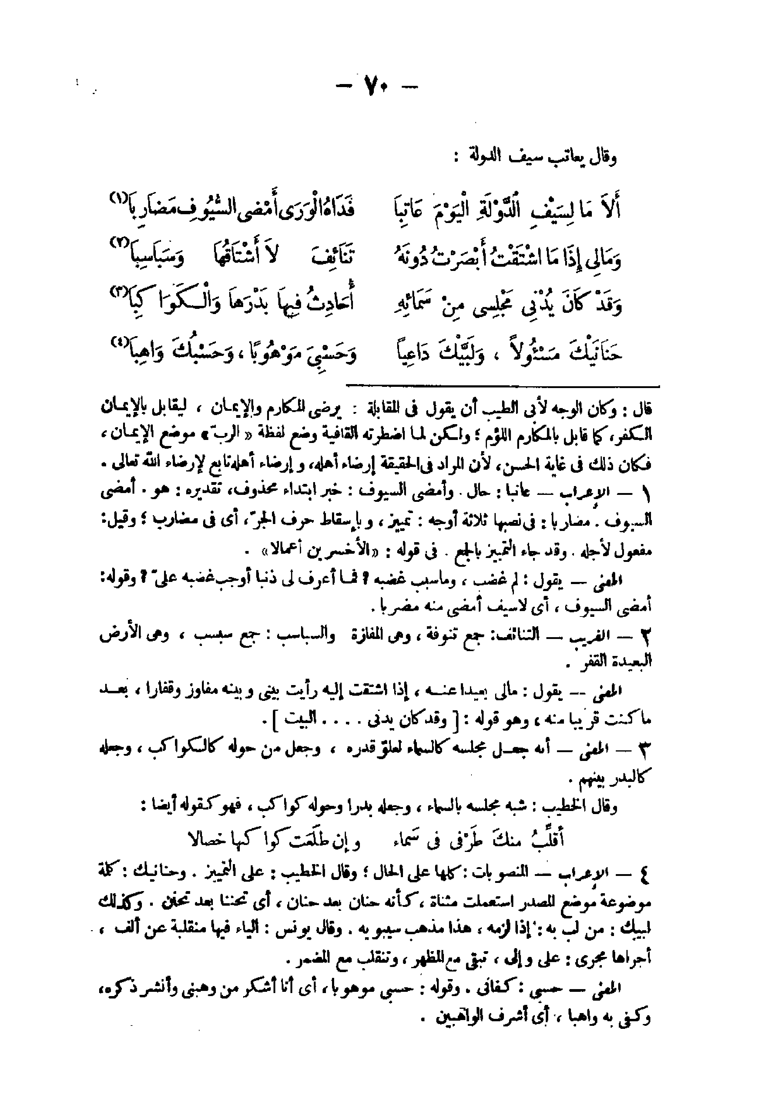 - 1 - الْإِعْرَاب عاتبا حَال وأمضى السيوف خبر ابْتِدَاء مَحْذُوف تَقْدِيره هُوَ أمضى السيوف مضاربا فى نصبها ثَلَاثَة أوجه تَمْيِيز وبأسقاط حرف الْجَرّ أى فى مضَارب وَقيل مفعول لأَجله وَقد جَاءَ التَّمْيِيز بِالْجمعِ فى قَوْله {الأخسرين أعمالا} الْمَعْنى يَقُول لم غضب وَمَا سَبَب غَضَبه فَمَا أعرف لى ذَنبا أوجب غَضَبه على وَقَوله أمضى السيوف أى لَا سيف أمضى مِنْهُ مضربا