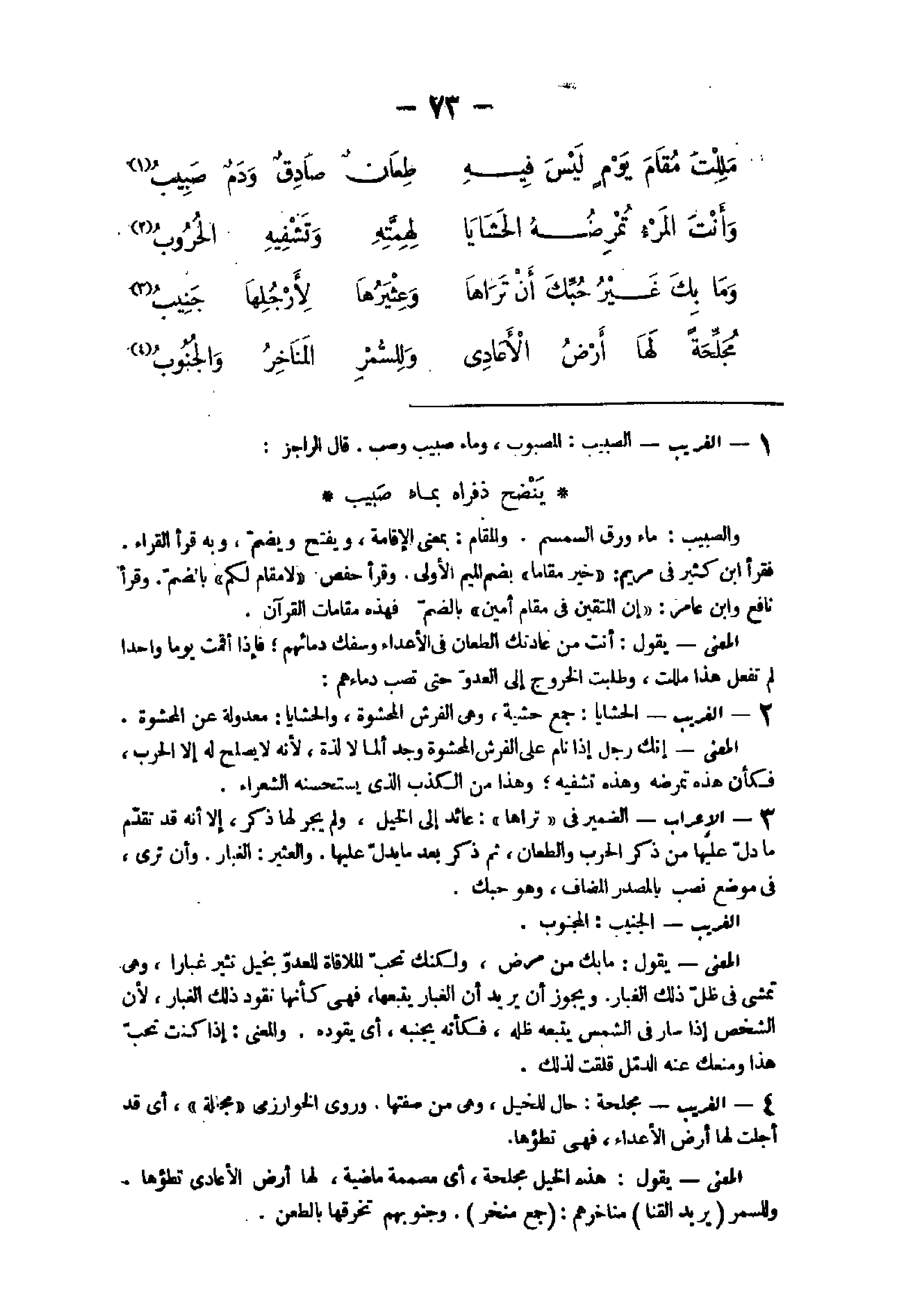 9 - الْغَرِيب مجلحة حَال للخيل وهى من صفتهَا وروى الخوارزمى محللة أى قد أحلّت لَهَا أَرض الْأَعْدَاء فَهِيَ تطؤها الْمَعْنى يَقُول هَذِه الْخَيل مجلحة أى مصممة مَاضِيَة لَهَا أَرض أَلا عادى تطؤها وللسمر يُرِيد القنا مناخرهم جمع منخر وجنوبهم تخرقها بالطعن