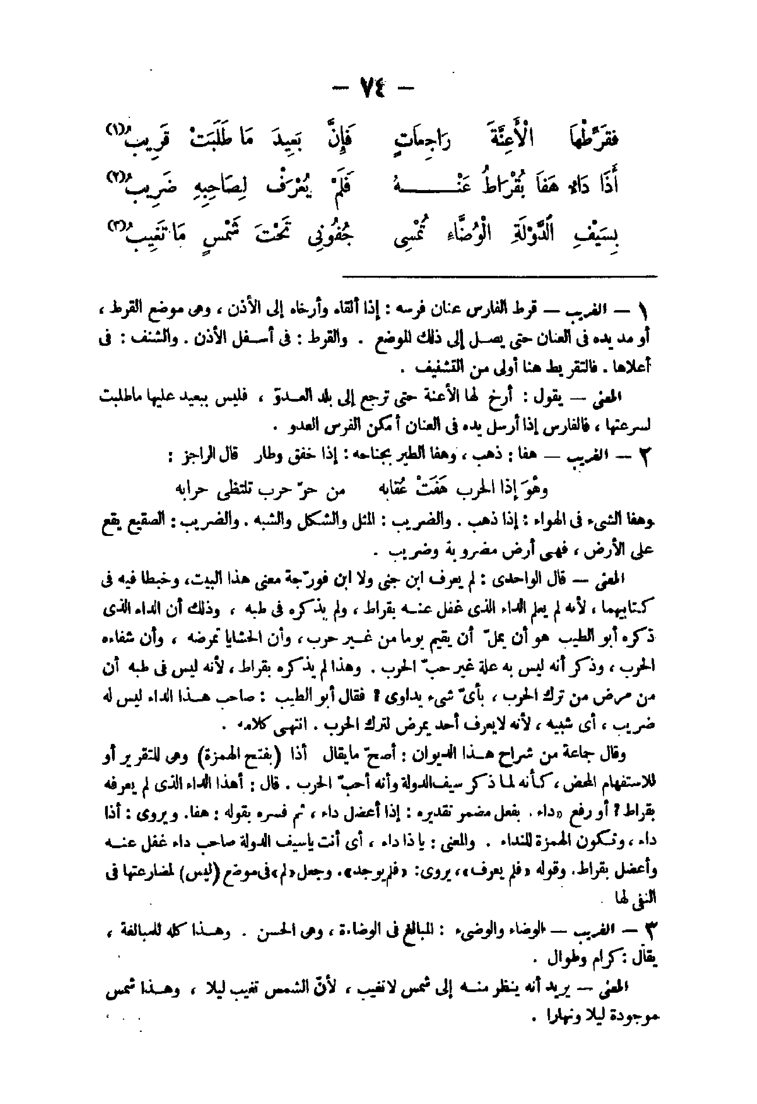 - الْغَرِيب قرط الْفَارِس عنان فرسه إِذا أَلْقَاهُ وأرخاه إِلَى الْأذن وهى مَوضِع القرط أَو مد يَده فى الْعَنَان حَتَّى يصل إِلَى ذَلِك الْموضع والقرط فى أَسْفَل الْأذن والشنف أَعْلَاهَا فالتقريط هُنَا أولى من التشنيف الْمَعْنى يَقُول أرخ لَهَا الأعنة حَتَّى ترجع إِلَى بلد الْعَدو فَلَيْسَ بِبَعِيد عَلَيْهَا مَا طلبت لسرعتها فالفارس إِذا أرسل يَده فى الْعَنَان أمكن الْفرس الْعَدو