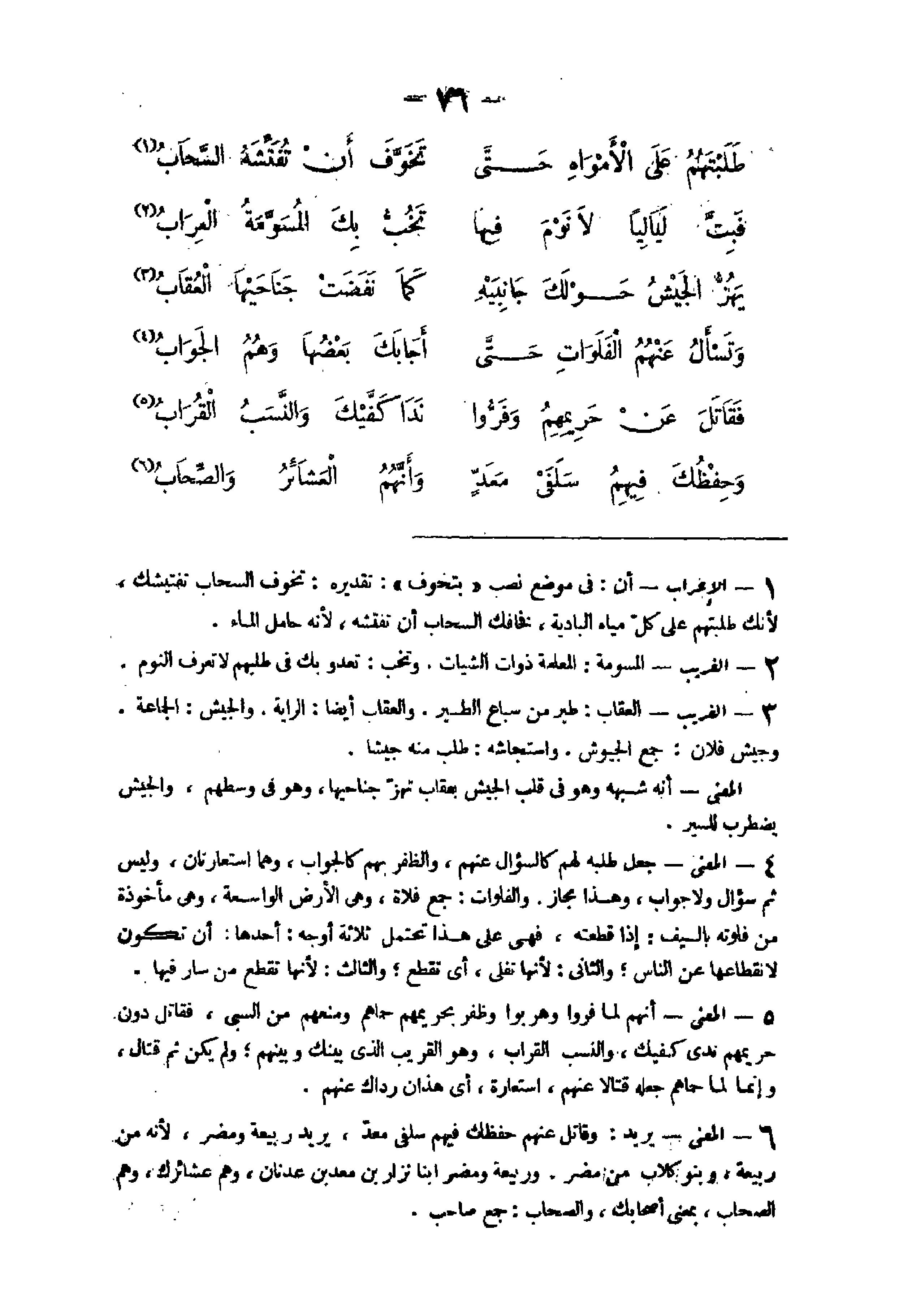 9 - الْمَعْنى يُرِيد وَقَاتل عَنْهُم حفظك فيهم سلفى معد يُرِيد ربيعَة وَمُضر لِأَنَّهُ من ربيعَة وَبَنُو كلاب من مُضر وَرَبِيعَة وَمُضر ابْنا نزار بن معد بن عدنان وهم عشائرك وهم الصحاب بِمَعْنى أَصْحَابك والصحاب جمع صَاحب