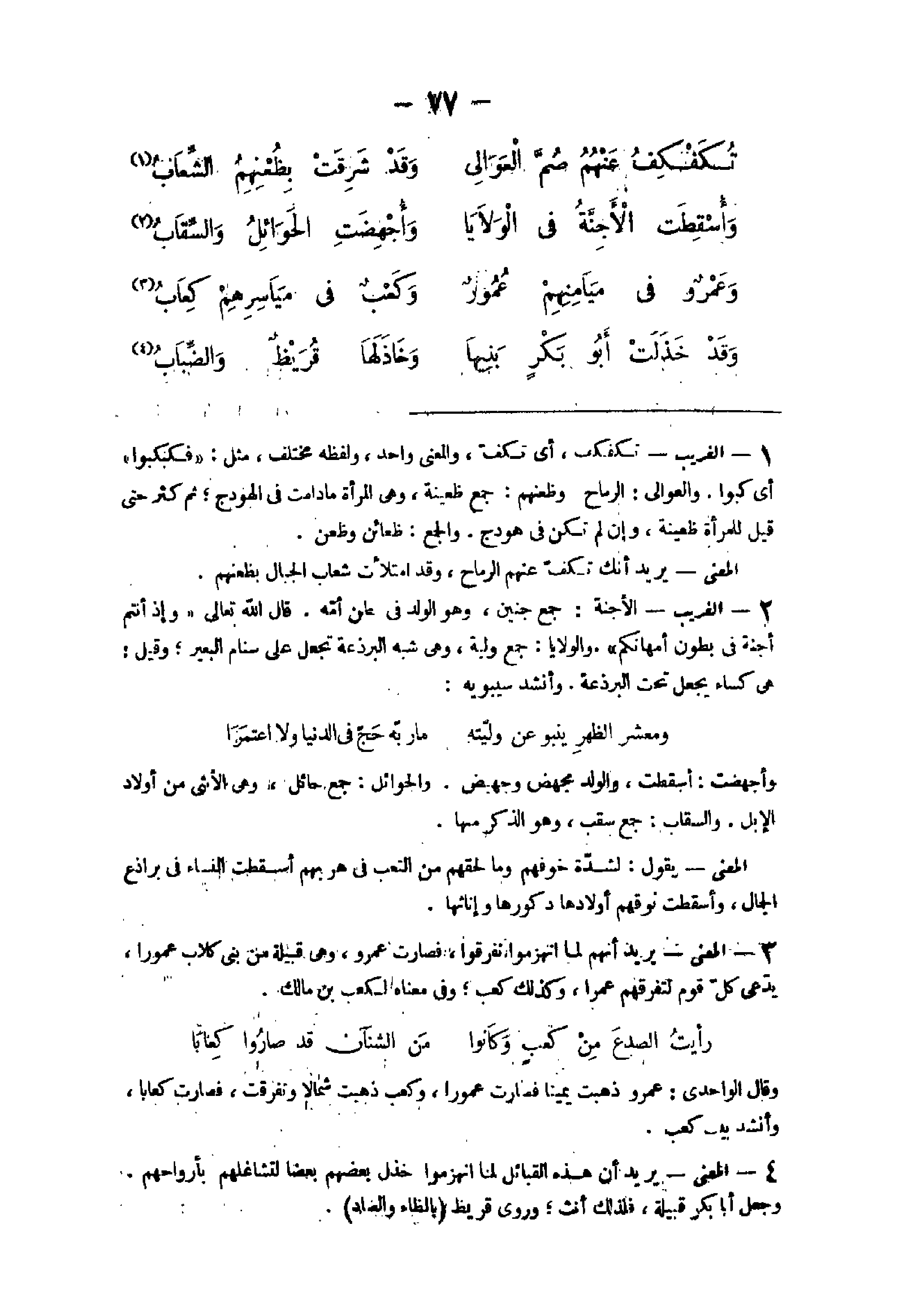 12 - الْمَعْنى يُرِيد أَنهم لما انْهَزمُوا تفَرقُوا فَصَارَت عَمْرو وهى قَبيلَة من بنى كلاب عمورا يدعى كل قوم لتفرقهم عمرا وَكَذَلِكَ كَعْب وفى مَعْنَاهُ لكعب بن مَالك