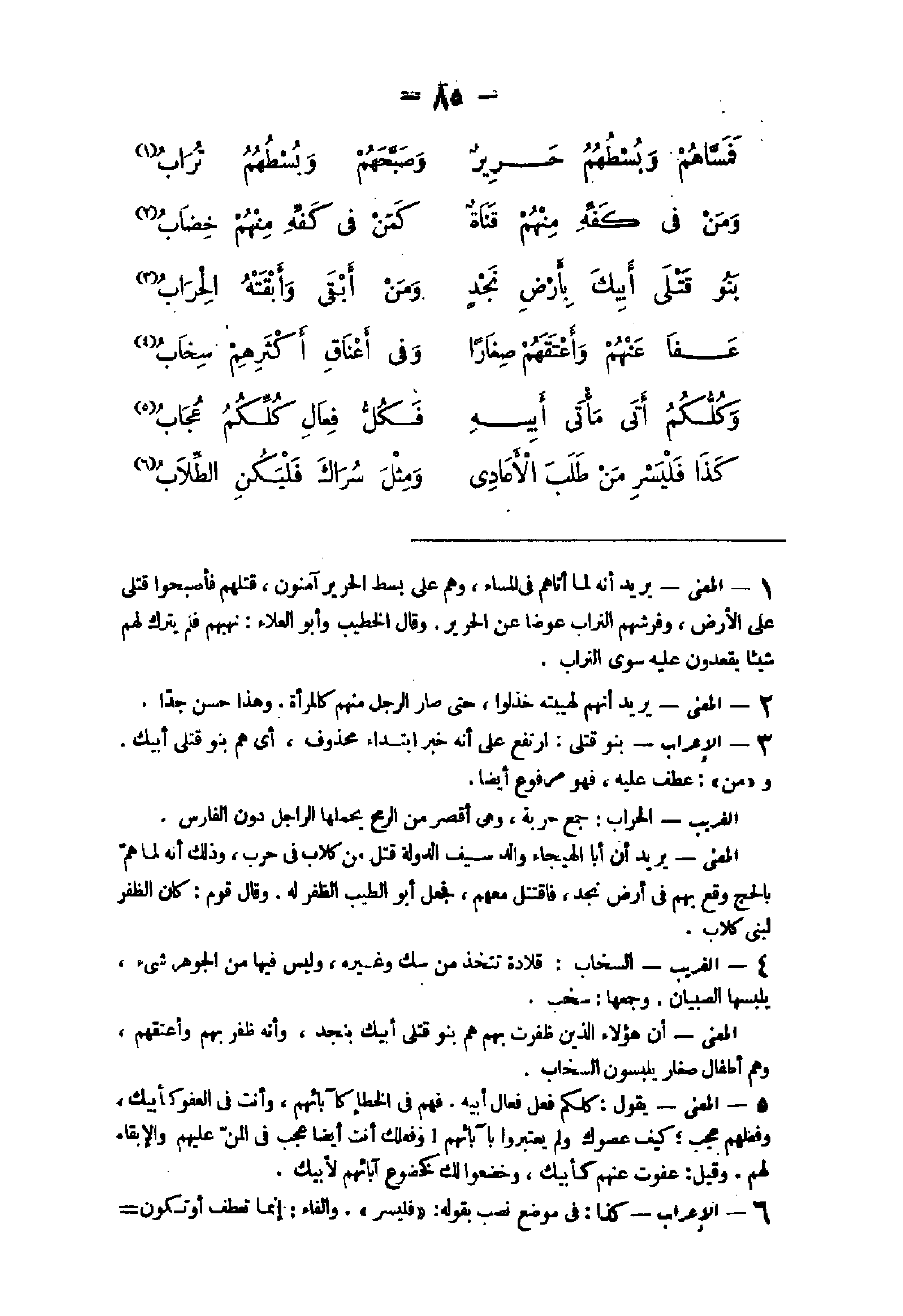 39 - الْإِعْرَاب بنوقتلى ارْتَفع على أَنه خبر ابْتِدَاء مَحْذُوف أى هم بنوقتلى أَبِيك وَمن عطف عَلَيْهِ فَهُوَ مَرْفُوع أَيْضا الْغَرِيب الحراب جمع حَرْبَة وهى أقصر من الرمْح يحملهَا الراجل دون الْفَارِس الْمَعْنى يُرِيد أَن أَبَا الهيجاء والدسيف الدولة قتل من كلاب فى حَرْب وَذَلِكَ أَنه لما هم بِالْحَجِّ وَقع بهم فى أَرض نجد فاقتتل مَعَهم فَجعل أَبُو الطّيب الظفر لَهُ وَقَالَ قوم كَانَ الظفر لبنى كلاب 40 - الْغَرِيب السخاب قلادة تتَّخذ من سك وَغَيره وَلَيْسَ فِيهَا من الْجَوْهَر شئ يلبسهَا الصّبيان وَجَمعهَا سخب الْمَعْنى أَن هَؤُلَاءِ الَّذين ظَفرت بهم هم بنوقتلى أَبِيك بِنَجْد وَأَنه ظفر بهم وأعتقهم وهم أَطْفَال صغَار يلبسُونَ السخاب