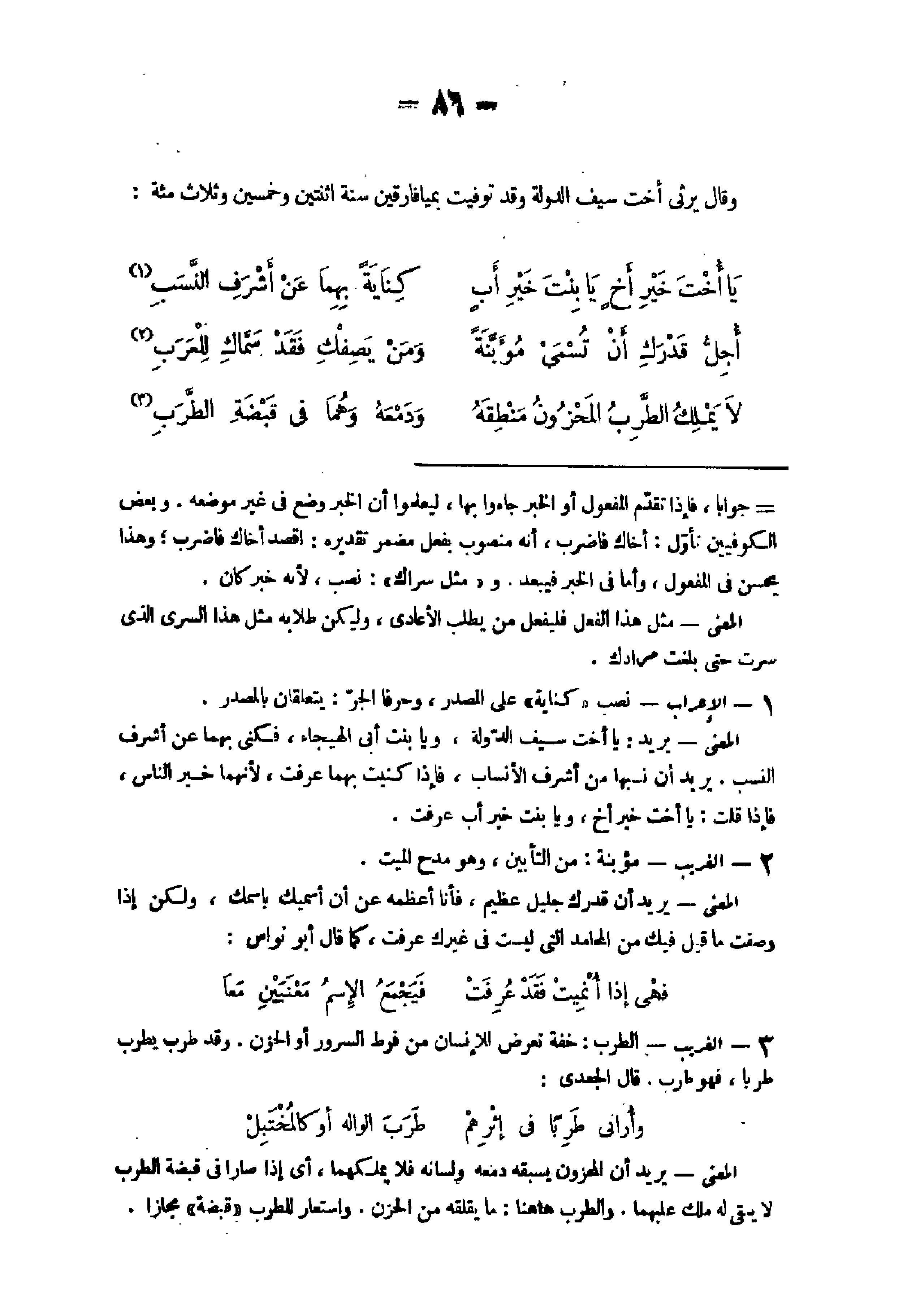 - 1 - الْإِعْرَاب نصب كِنَايَة على الْمصدر وحرفا الْجَرّ يتعلقان بِالْمَصْدَرِ الْمَعْنى يُرِيد يَا أُخْت سيف الدولة وَيَا بنت أَبى الهيجاء فكنى بهما عَن أشرف النّسَب يُرِيد أَن نَسَبهَا من أشرف الْأَنْسَاب فَإِذا كنيت بهما عرفت لِأَنَّهُمَا خير النَّاس فَإِذا قلت يَا أُخْت خير أَخ وَيَا بنت خير أَب عرفت