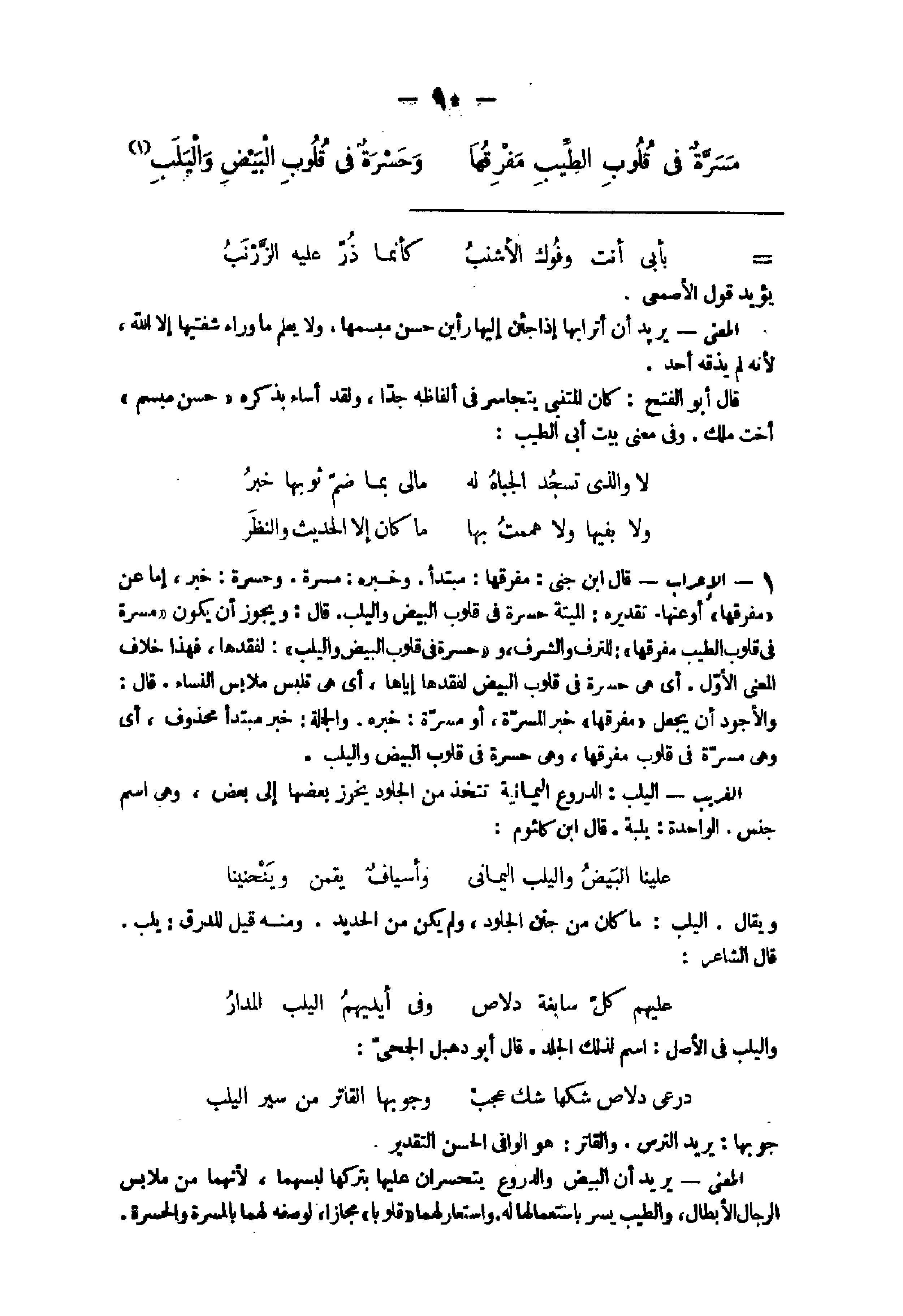 - الْإِعْرَاب قَالَ ابْن جنى مفرقها مُبْتَدأ وَخَبره مَسَرَّة وحسرة خبر إِمَّا عَن مفرقها أَو عَنْهَا تَقْدِيره الْميتَة حسرة فى قُلُوب الْبيض واليلب قَالَ وَيجوز أَن يكون مَسَرَّة فى قُلُوب الطّيب مفرقها للترف والشرف وحسرة فى قُلُوب الْبيض واليلب لفقدها فَهَذَا خلاف الْمَعْنى الأول أى هى حسرة فى قُلُوب الْبيض لفقدها إِيَّاهَا أى هى تلبس ملابس النِّسَاء قَالَ والأجود أَن يَجْعَل مفرقها خبر المسرة أَو مَسَرَّة خَبره وَالْجُمْلَة خبر مبتدإ مَحْذُوف أى وهى مَسَرَّة فى قُلُوب مفرقها وهى حسرة فى قُلُوب الْبيض واليلب الْغَرِيب اليلب الدروع اليمانية تتَّخذ من الْجُلُود يخرز بَعْضهَا إِلَى بعض وهى اسْم جنس الْوَاحِدَة يلبة قَالَ ابْن كُلْثُوم