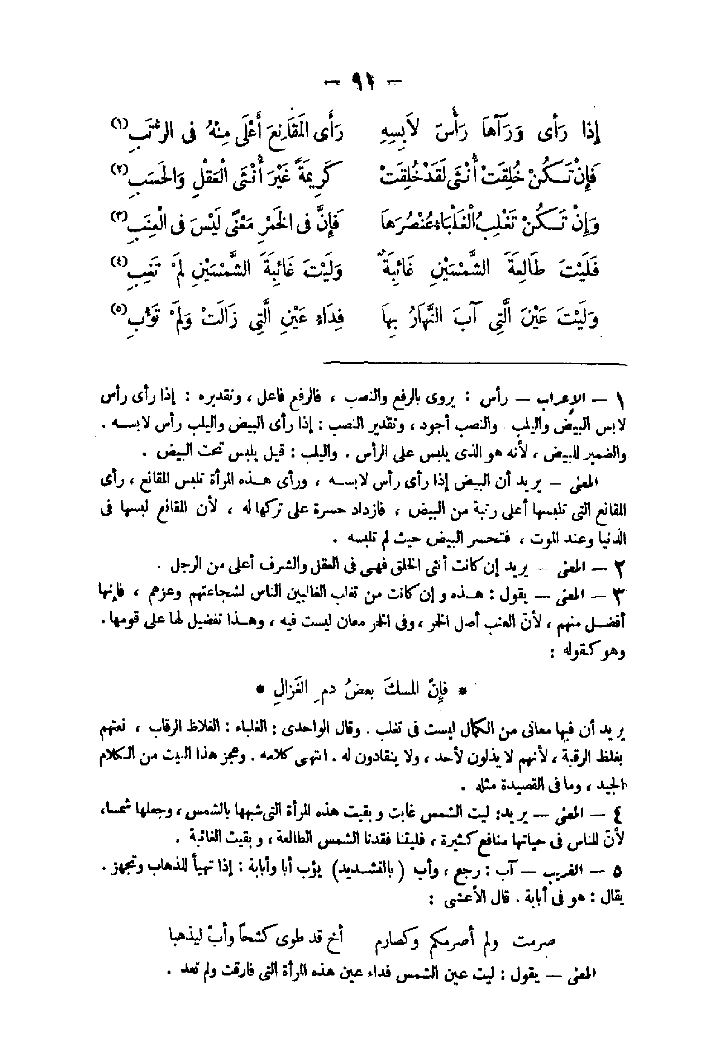 - الْإِعْرَاب رَأس يرْوى بِالرَّفْع وَالنّصب فالرفع فَاعل وَتَقْدِيره إِذا رأى رَأس لابس الْبيض واليلب وَالنّصب أَجود وَتَقْدِير النصب إِذا رأى الْبيض واليلب رَأس لابسه وَالضَّمِير للبيض لِأَنَّهُ هُوَ الَّذِي يلبس على الرَّأْس واليلب قيل يلبس تَحت الْبيض الْمَعْنى يُرِيد أَن الْبيض إِذا رأى رَأس لابسه وَرَأى هَذِه الْمَرْأَة تلبس المقانع رأى المقانع الَّتِي تلبسها أَعلَى رُتْبَة من الْبيض فازداد حسرة على تَركهَا لَهُ لِأَن المقانع لبسهَا فى الدُّنْيَا وَعند الْمَوْت فتحسر الْبيض حَيْثُ لم تلبسه