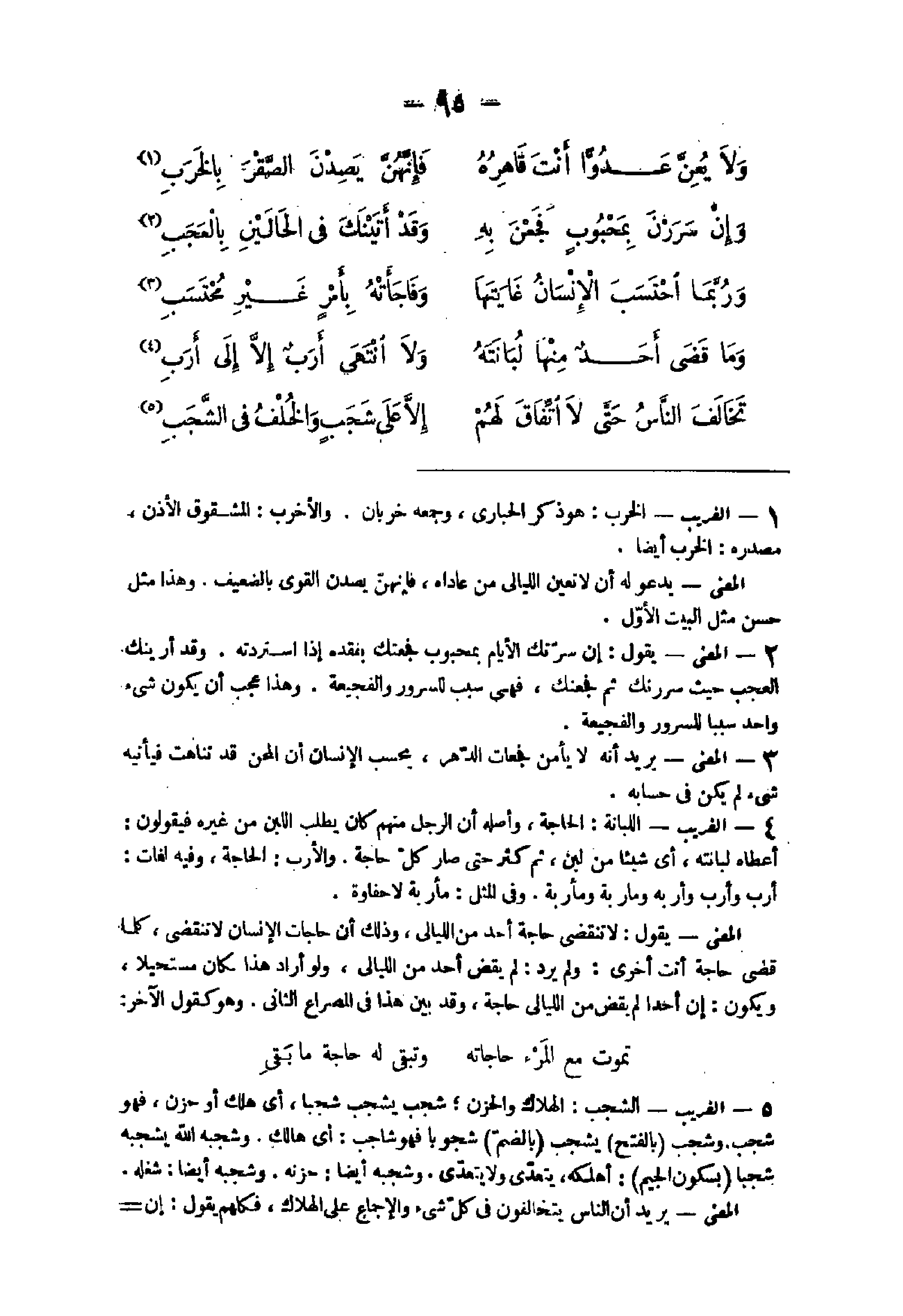 41 - الْغَرِيب اللبانة الْحَاجة وَأَصله أَن الرجل مِنْهُم كَانَ يطْلب اللَّبن من غَيره فَيَقُولُونَ أعطَاهُ لبانته أى شَيْئا من لبن ثمَّ كثر حَتَّى صَار كل حَاجَة والأرب الْحَاجة وَفِيه لُغَات أرب وإرب وإربة ومأربة ومأربة وفى الْمثل مأربة لَا حفاوة الْمَعْنى يَقُول لَا تنقضى حَاجَة أحد من الليالى وَذَلِكَ أَن حاجات الْإِنْسَان لَا تنقضى كلما قضى حَاجَة أَتَت أُخْرَى وَلم يرد لم يقْض أحد من الليالى وَلَو أَرَادَ هَذَا لَكَانَ مستحيلا وَيكون إِن أحدا لم يقْض من الليالى حَاجَة وَقد بَين هَذَا فى المصراع الثَّانِي وَهُوَ كَقَوْل الآخر