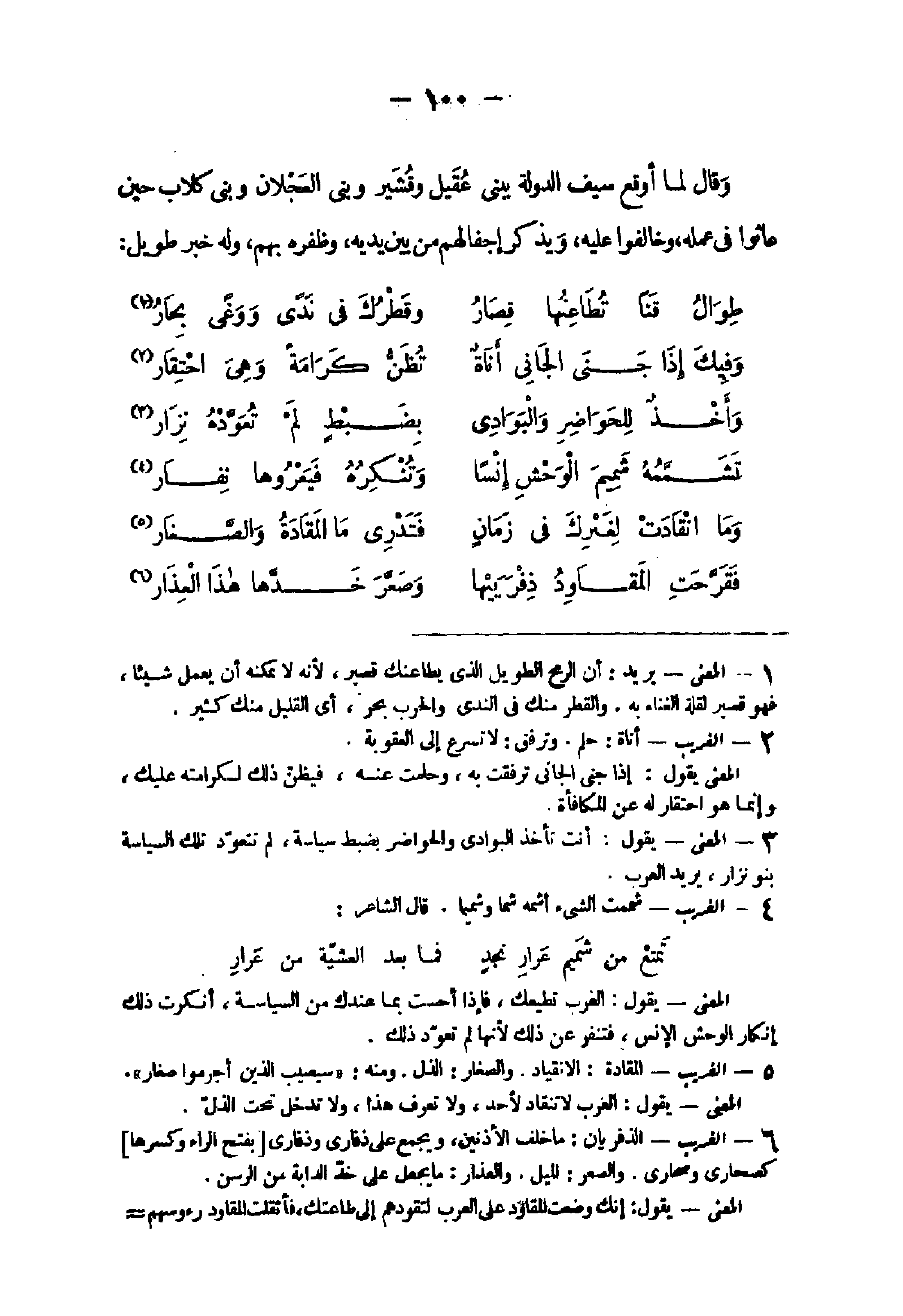 - 1 - الْمَعْنى يُرِيد أَن الرمْح الطَّوِيل الذى يطاعنك قصير لِأَنَّهُ لَا يُمكنهُ أَن يعْمل شَيْئا فَهُوَ قصير لقلَّة الْغناء بِهِ والقطر مِنْك فى الندى وَالْحَرب بَحر أى الْقَلِيل مِنْك كثير 2 - الْغَرِيب أَنَاة حلم وترفق لَا تسرع إِلَى الْعقُوبَة الْمَعْنى يَقُول إِذا جنى الجانى ترفقت بِهِ وحلمت عَنهُ فيظن ذَلِك لكرامته عَلَيْك وَإِنَّمَا هُوَ احتقار لَهُ عَن الْمُكَافَأَة