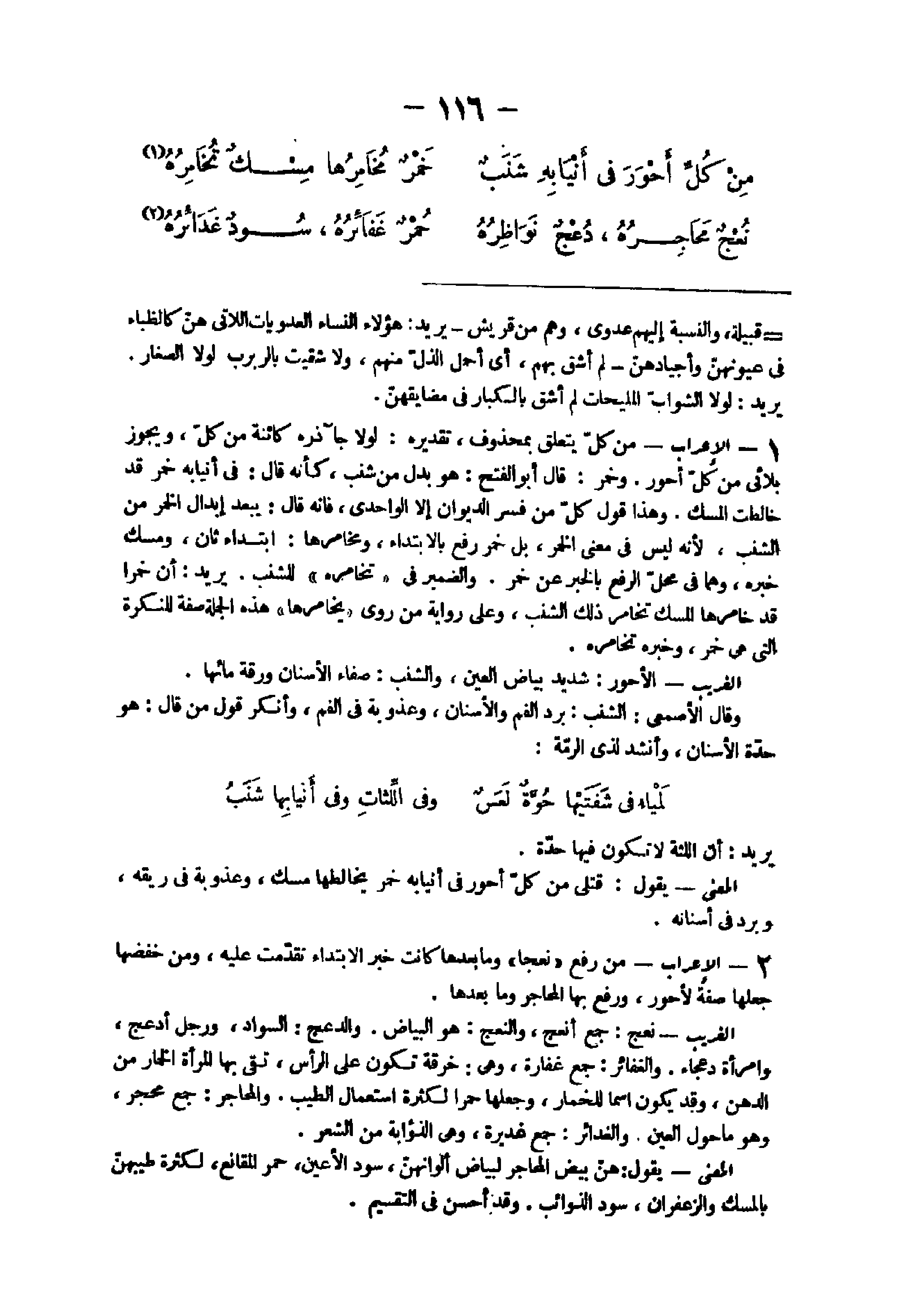 5 - الْإِعْرَاب من رفع نعجا وَمَا بعْدهَا كَانَت خبر الِابْتِدَاء تقدّمت عَلَيْهِ وَمن خفضها جعلهَا صفة لأحور وَرفع بهَا المحاجر وَمَا بعْدهَا الْغَرِيب نعج جمع أنعج والنعج هُوَ الْبيَاض والدعج السوَاد وَرجل أدعج وَامْرَأَة دعجاء والغفائر جمع غفارة وهى خرقَة تكون على الرَّأْس تقى بهَا الْمَرْأَة الْخمار من الدّهن وَقد يكون اسْما للخمار وَجعلهَا حمرا لِكَثْرَة اسْتِعْمَال الطّيب والمحاجر جمع محجر وَهُوَ مَا حول الْعين والغدائر جمع غديرة وهى الذؤابة من الشّعْر الْمَعْنى يَقُول هن بيض المحاجر لبياض ألوانهن سود الْأَعْين حمر المقانع لِكَثْرَة طيبهن بالمسك والزعفران سود الذوائب وَقد أحسن فى التَّقْسِيم