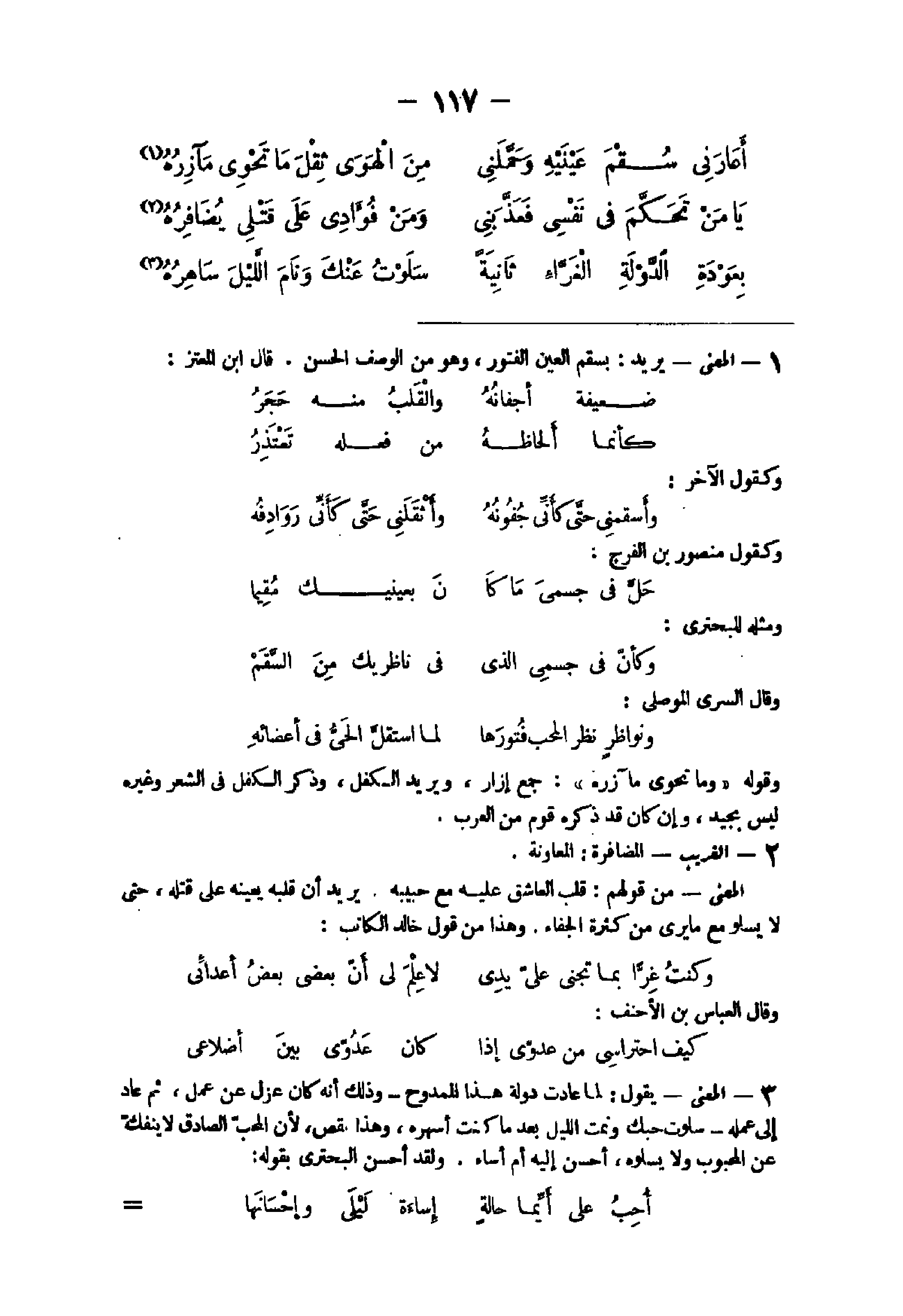 والمحب الصَّادِق كلما عنت لَهُ خطرة من السلو رده الْحبّ الصَّادِق عَمَّا كَانَ عزم وَلَقَد أحسن البحترى أَيْضا بقوله