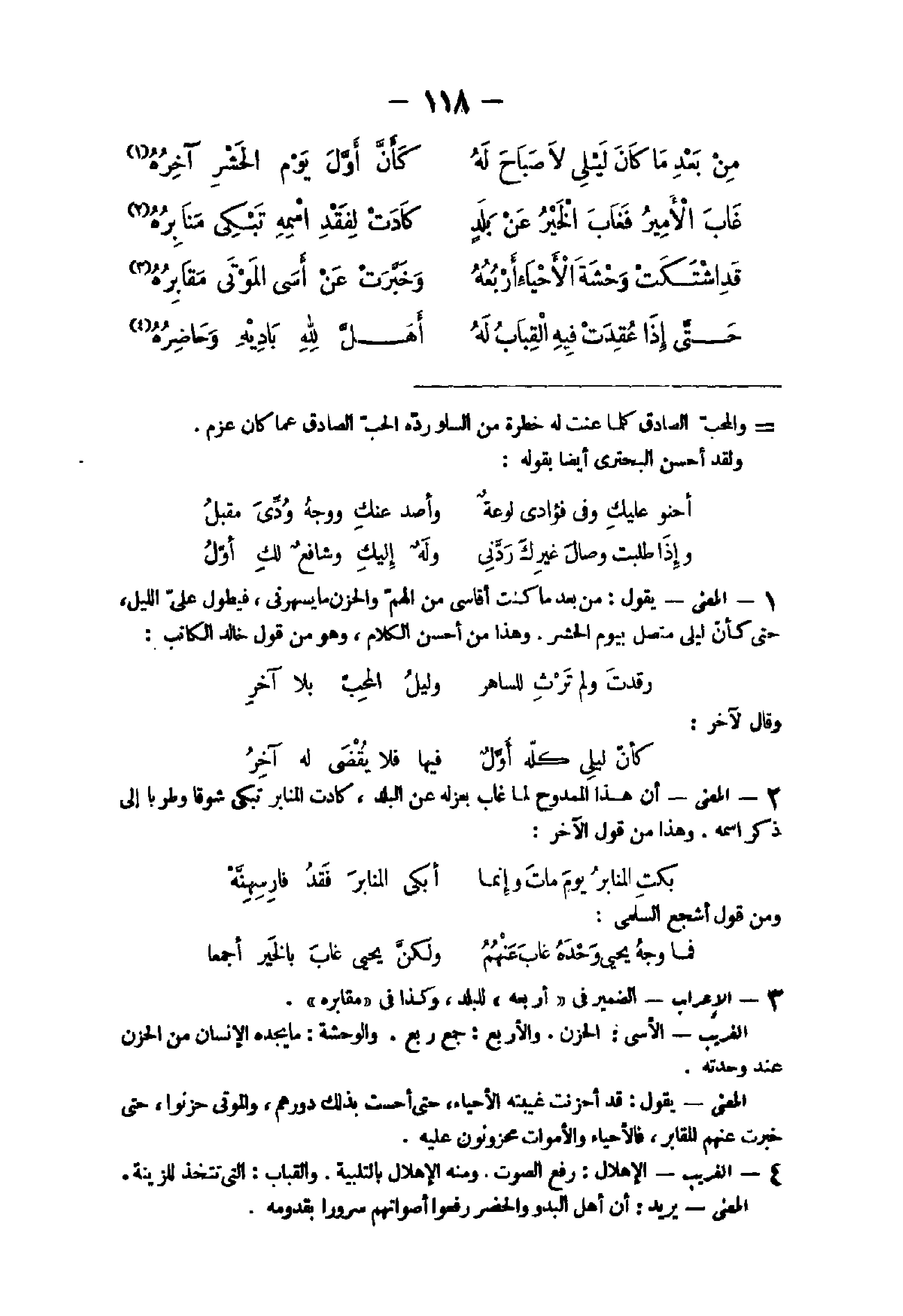 11 - الْإِعْرَاب الضَّمِير فى أَرْبَعَة للبلد وَكَذَا فى مقابره الْغَرِيب الأسى الْحزن والأربع جمع ربع والوحشة مَا يجده الْإِنْسَان من الْحزن عِنْد وحدته الْمَعْنى يَقُول قد أحزنت غيبته الْأَحْيَاء حَتَّى أحست بذلك دُورهمْ والموتى حزنوا حَتَّى خبرت عَنْهُم الْمَقَابِر فالأحياء والأموات محزنون عَلَيْهِ