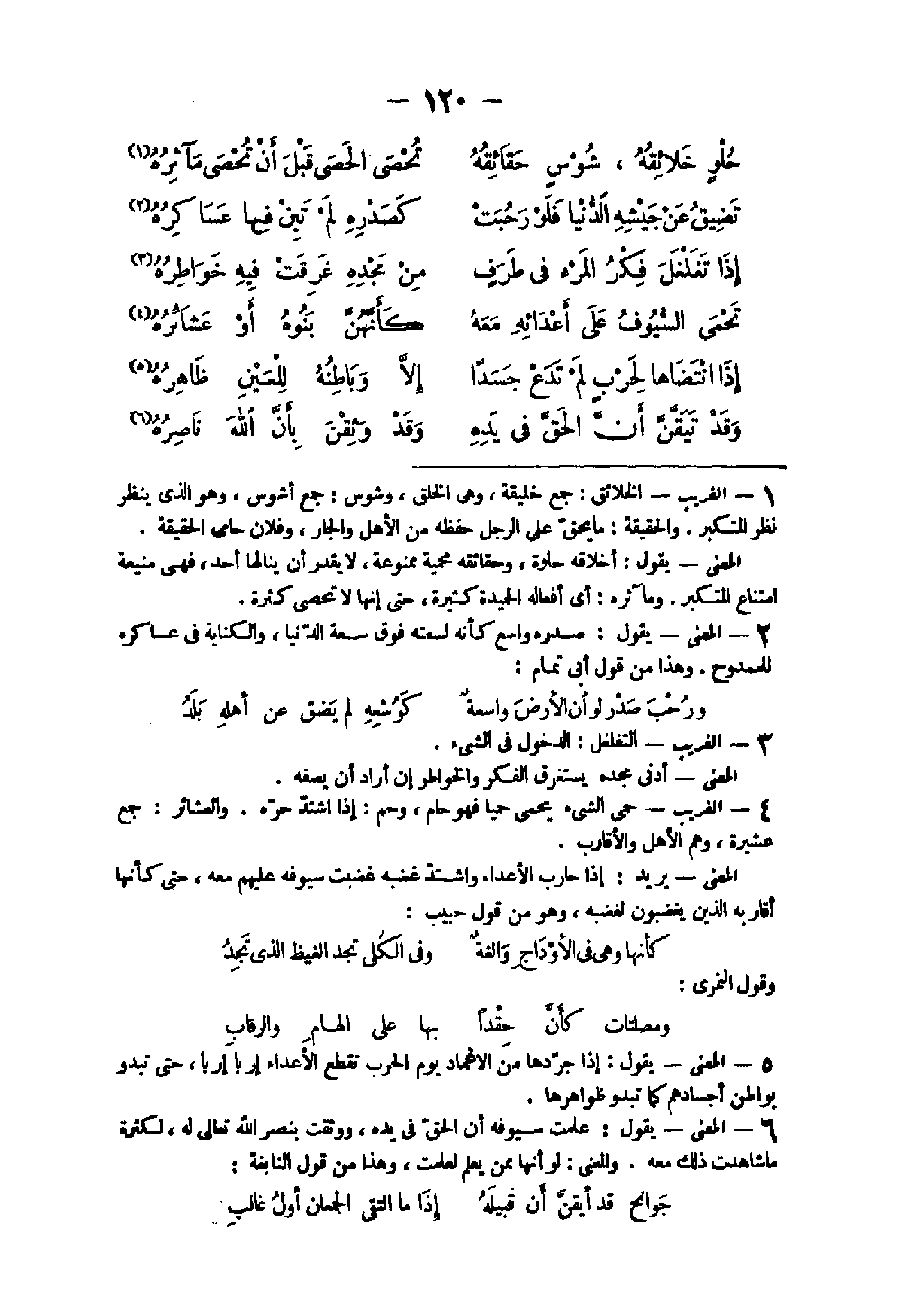 - الْغَرِيب الْخَلَائق جمع خَلِيقَة وهى الْخلق وشوس جمع أشوس وَهُوَ الذى ينظر نظر المتكبر والحقيقة مَا يحِق على الرجل حفظه من الْأَهْل وَالْجَار وَفُلَان حامى الْحَقِيقَة الْمَعْنى يَقُول أخلاقه حلوة وحقائقه محمية مَمْنُوعَة لَا يقدر أَن ينالها أحد فهى منيعة امْتنَاع المتكبر ومآثره أى أَفعاله الحميدة كَثِيرَة حَتَّى إِنَّهَا لَا تحصى كَثْرَة