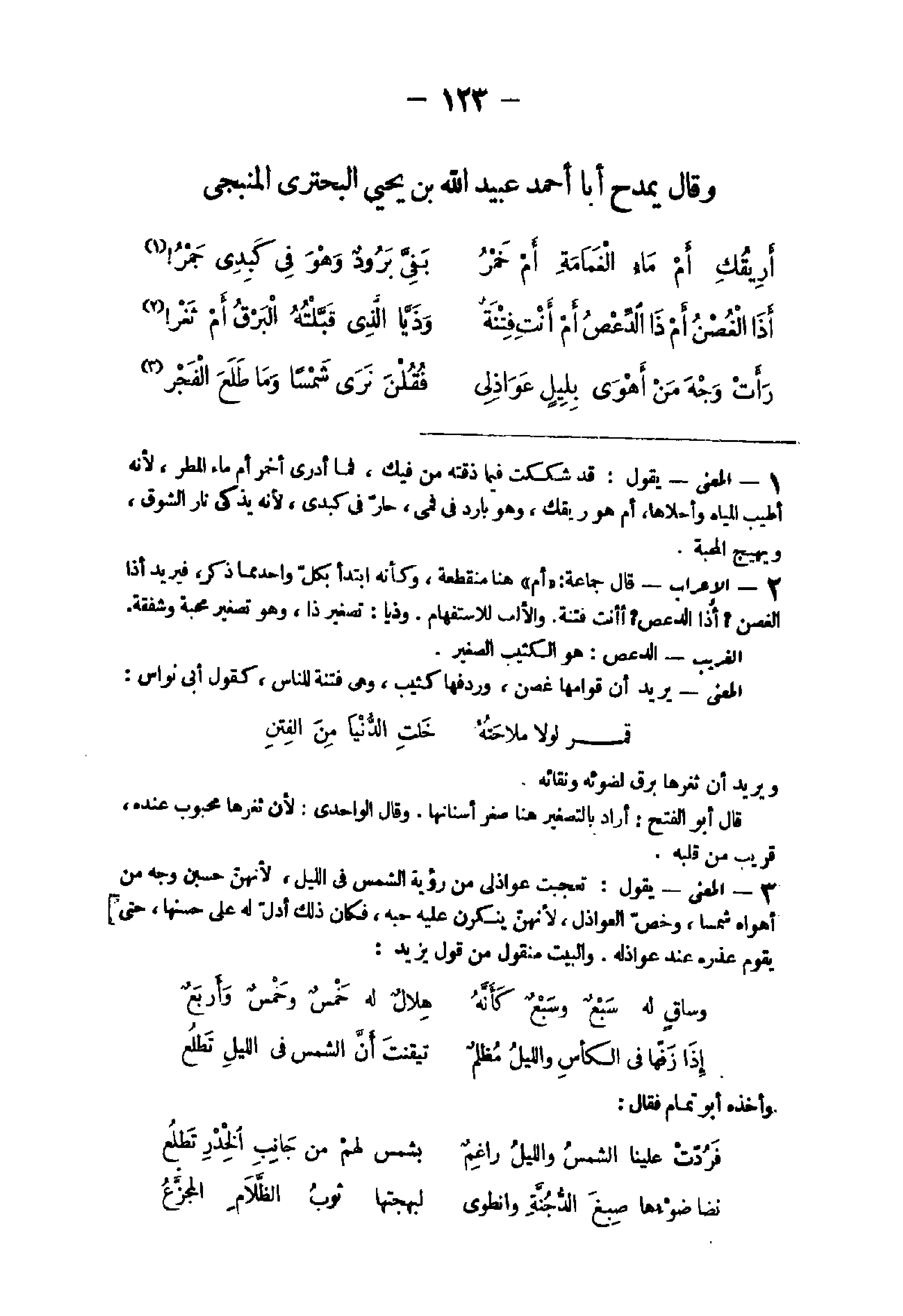 - 1 - الْمَعْنى يَقُول قد شَككت فِيمَا ذقته من فِيك فَمَا أدرى أخمر أم مَاء الْمَطَر لِأَنَّهُ أطيب الْمِيَاه وأحلاها أم هُوَ ريقك وَهُوَ بَارِد فى فمى حَار فى كبدى لِأَنَّهُ يذكى نَار الشوق ويهيج الْمحبَّة