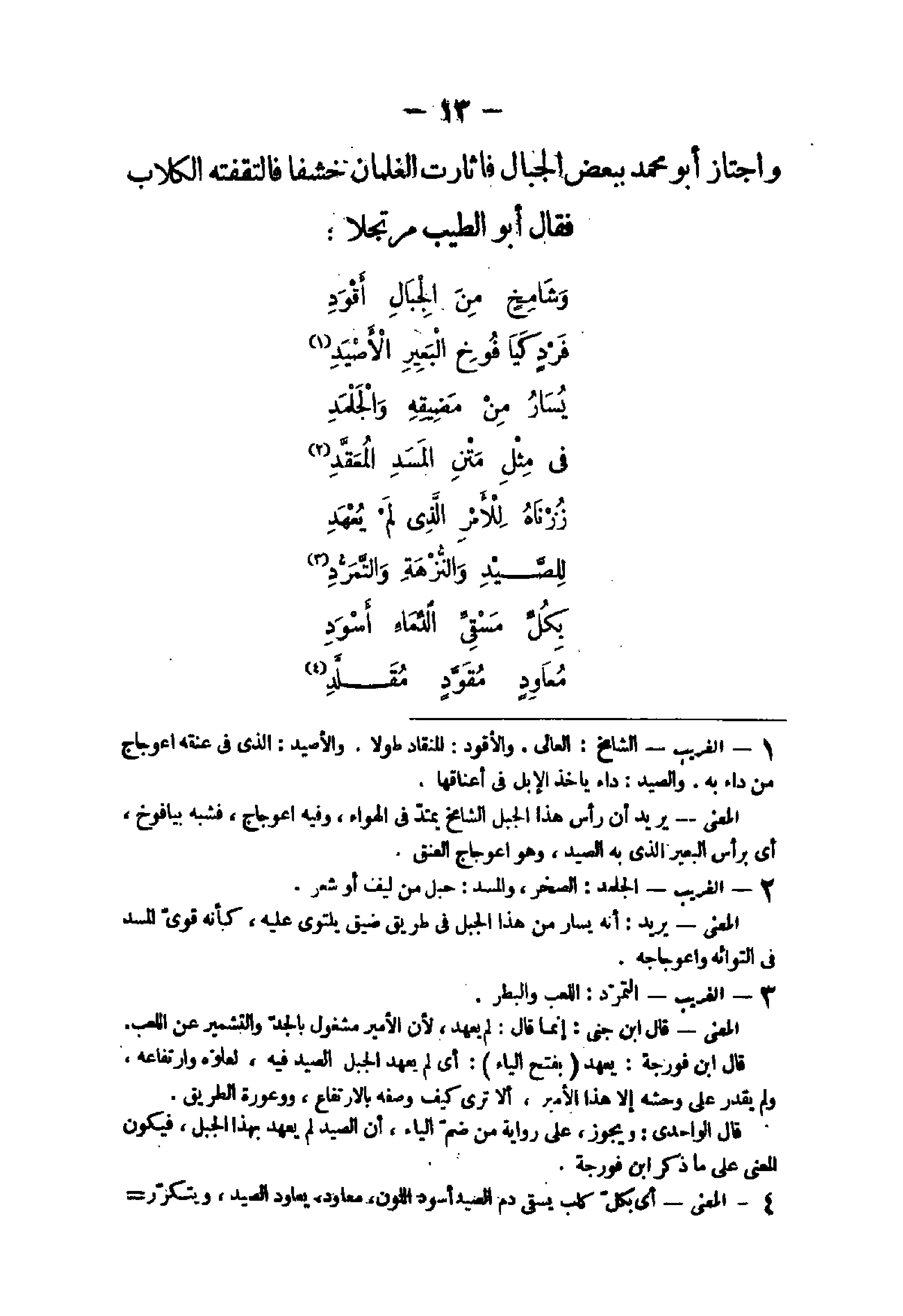 - 1 - الْغَرِيب الشامخ العالى والأقود المنقاد طولا والأصيد الذى فى عُنُقه اعوجاج من دَاء بِهِ وَالصَّيْد دَاء يَأْخُذ الْإِبِل فى أعناقها الْمَعْنى يُرِيد أَن رَأس هَذَا الْجَبَل الشامخ يَمْتَد فى الْهَوَاء وَفِيه اعوجاج فَشبه بيافوخ أى بِرَأْس الْبَعِير الذى بِهِ الصَّيْد وَهُوَ اعوجاج الْعُنُق
