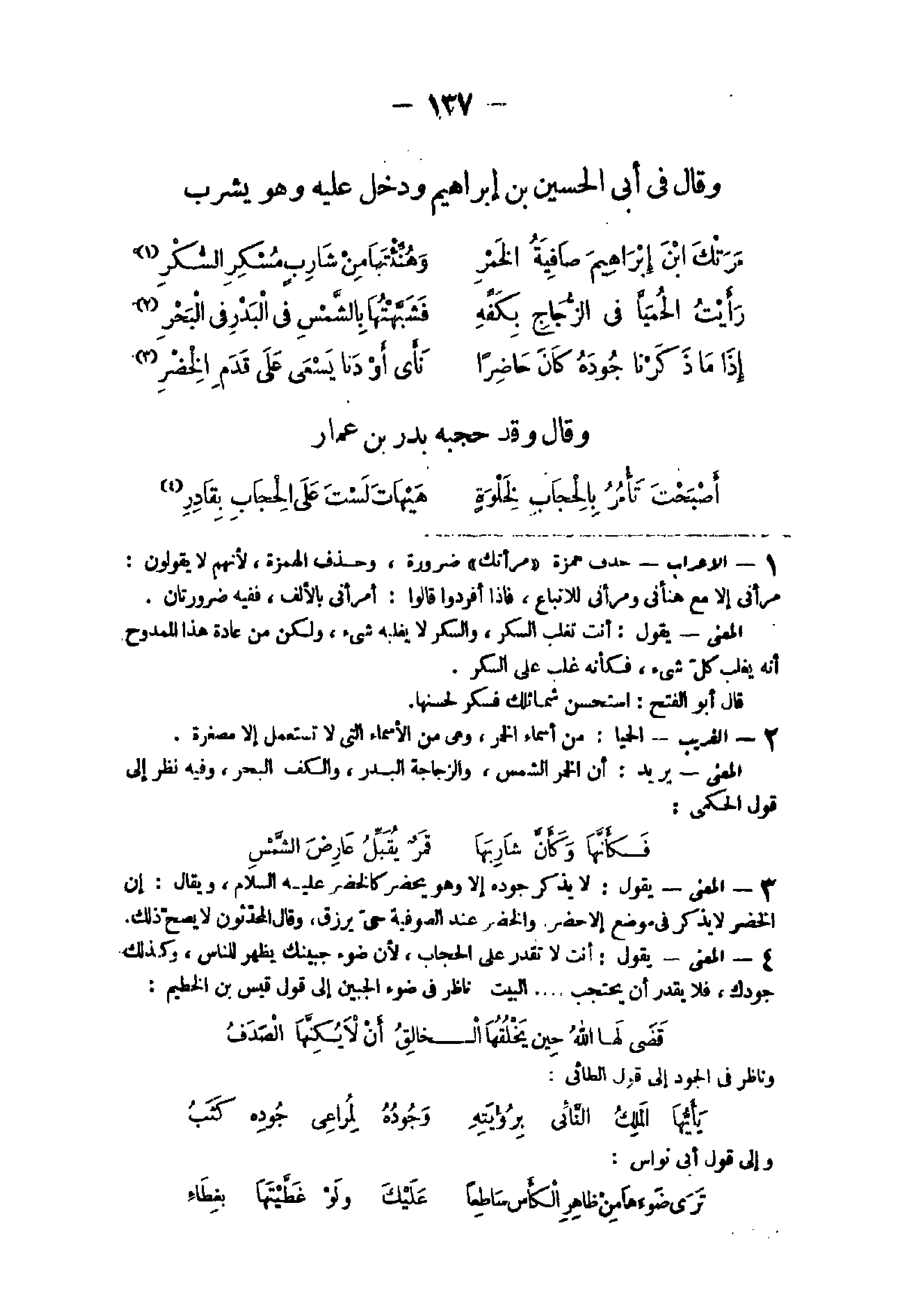 - 1 - الْإِعْرَاب حذف همزَة مرأتك ضَرُورَة وَحذف الْهمزَة لأَنهم لَا يَقُولُونَ مرأنى إِلَّا مَعَ هنأنى ومرأنى للإتباع فَإِذا أفردوا قَالُوا أمرأنى فَفِيهِ ضرورتان الْمَعْنى يَقُول أَنْت تغلب السكر وَالسكر لَا يغلبه شئ وَلَكِن من عَادَة هَذَا الممدوح أَنه يغلب كل شئ فَكَأَنَّهُ غلب على السكر