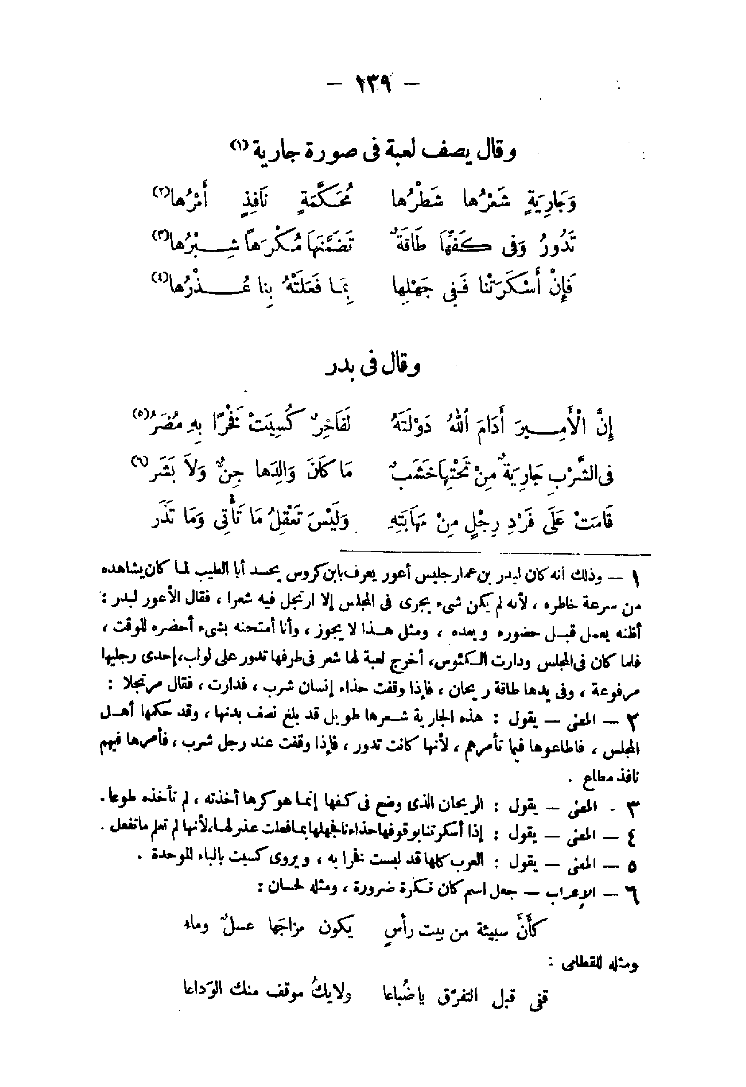 - 1 - وَذَلِكَ أَنه كَانَ لبدر بن عمار جليس أَعور يعرف بِابْن كروس يحْسد أَبَا الطّيب لما كَانَ يُشَاهِدهُ من سرعَة خاطره لِأَنَّهُ لم يكن شئ يجرى فى الْمجْلس إِلَّا ارتجل فِيهِ شعرًا فَقَالَ الْأَعْوَر لبدر أَظُنهُ يعْمل قبل حُضُوره ويعده وَمثل هَذَا لَا يجوز وَأَنا أمتحنه بشئ أحضرهُ للْوَقْت فَلَمَّا كَانَ فى الْمجْلس ودارت الكئوس أخرج لعبة لَهَا شعر فى طرفها تَدور على لولب إِحْدَى رِجْلَيْهَا مَرْفُوعَة وفى يَدهَا طَاقَة ريحَان فَإِذا وقفت حذاء إِنْسَان شرب فدارت فَقَالَ مرتجلا
