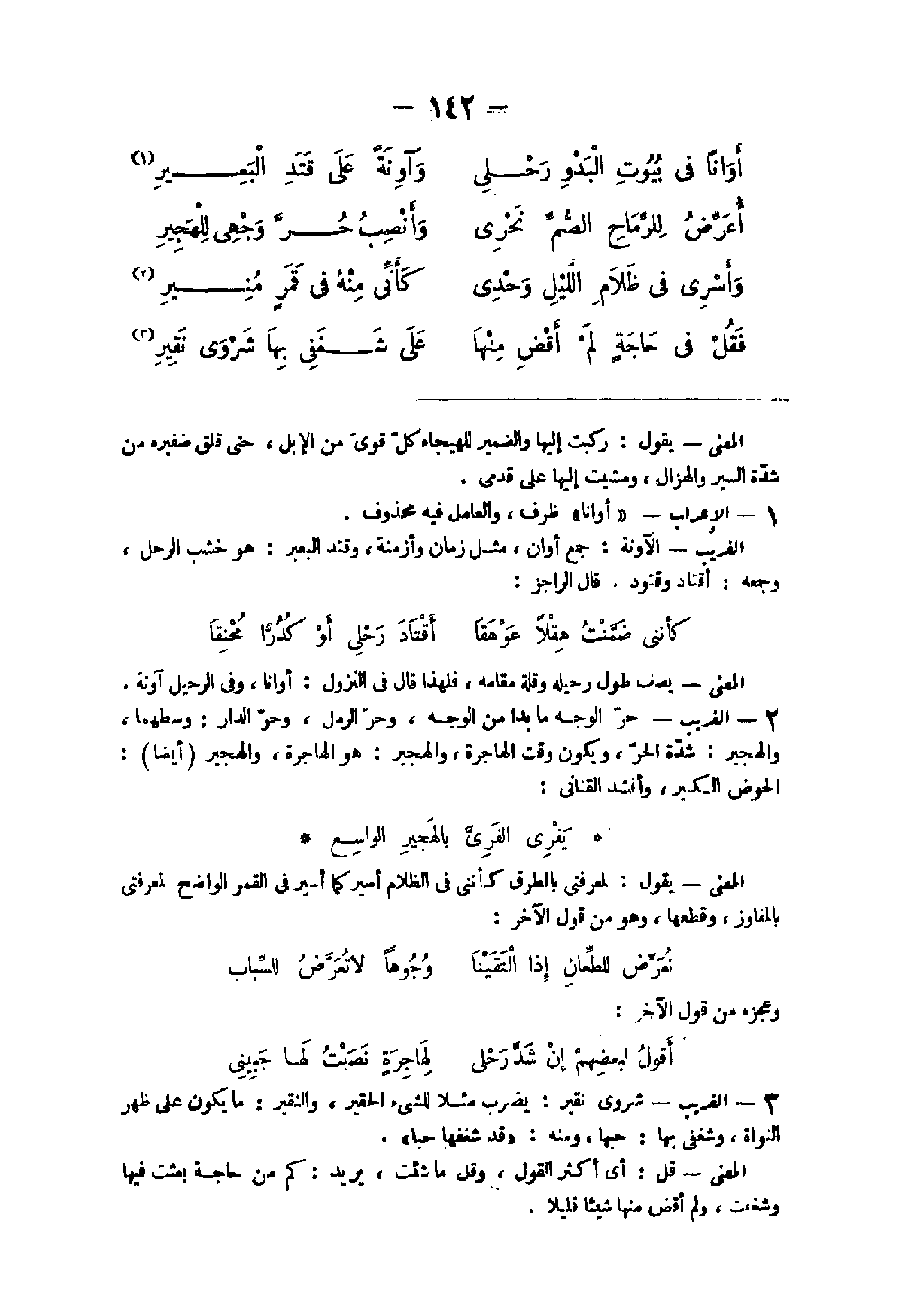 - الْإِعْرَاب أوانا ظرف وَالْعَامِل فِيهِ مَحْذُوف الْغَرِيب الآونة جمع أَوَان مثل زمَان وأزمنة وقتد الْبَعِير هُوَ خشب الرحل وَجمعه أقتاد وقتود قَالَ الراجز