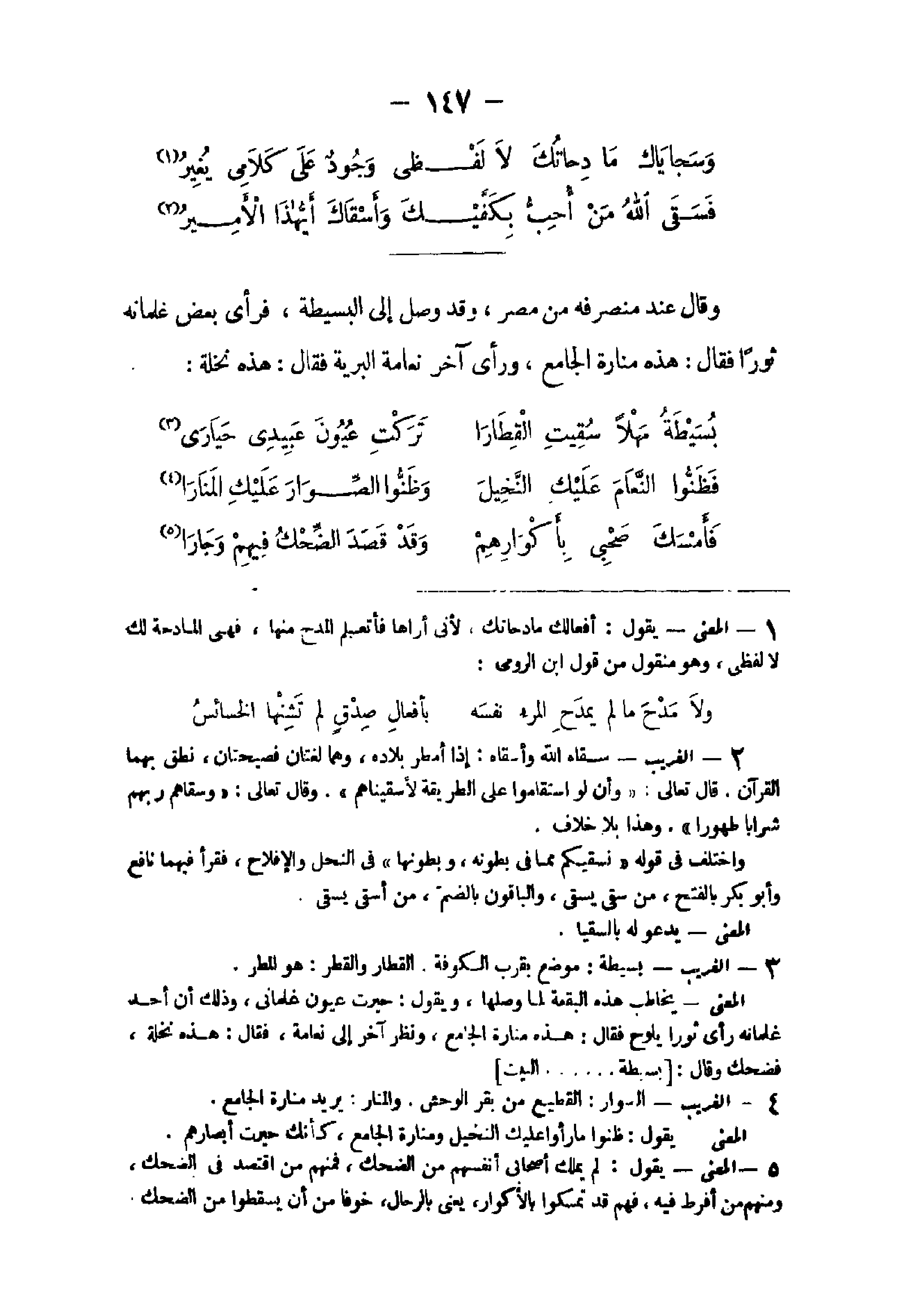 1 - الْغَرِيب بسيطة مَوضِع بِقرب الْكُوفَة القطار والقطر هُوَ الْمَطَر الْمَعْنى يُخَاطب هَذِه الْبقْعَة لما وَصلهَا وَيَقُول حيرت عُيُون غلمانى وَذَلِكَ أَن أحد غلمانه رأى ثورا يلوح فَقَالَ هَذِه مَنَارَة الْجَامِع وَنظر آخر إِلَى نعَامَة فَقَالَ هَذِه نَخْلَة فَضَحِك وَقَالَ