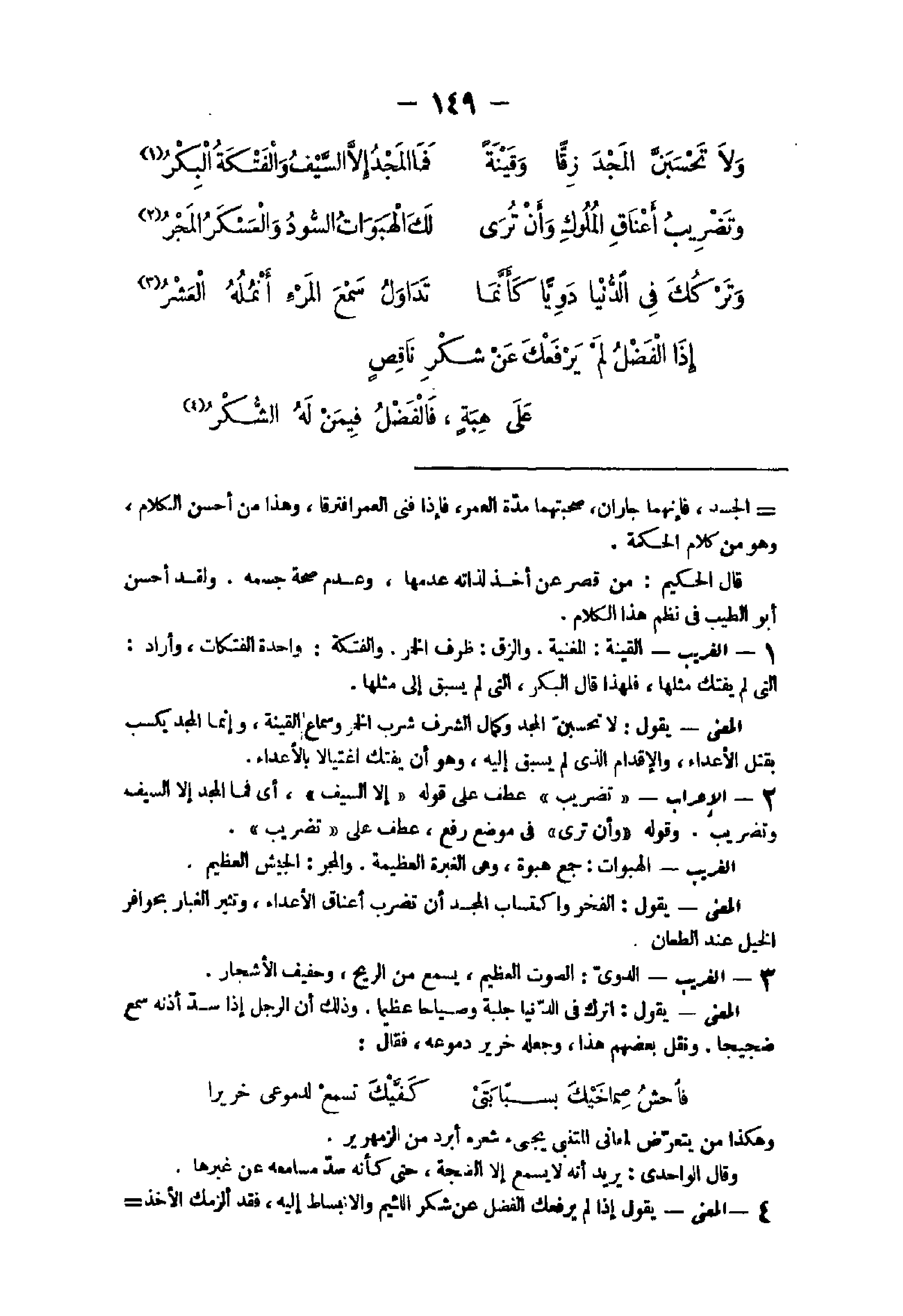 9 - الْمَعْنى يَقُول إِذا لم يرفعك الْفضل عَن شكر اللَّئِيم والانبساط إِلَيْهِ فقد ألزمك الْأَخْذ مِنْهُ شكره وَإِذا صَار مشكورا فَإِن الْفضل لَهُ وَقَالَ أَبُو الْفَتْح إِذا اضطرتك الْحَال إِلَى أَن تشكر اصاغر النَّاس على مَا تتبلغ بِهِ فالفضل فِيك وَلَك لَا للممدوح المشكور وَقَالَ أَبُو الْفضل العروضى يَقُول أَبُو الطّيب فالفضل فِيمَن لَهُ الشُّكْر وَيَقُول أَبُو الْفَتْح فالفضل فِيك وَلَك فَتغير اللَّفْظ وَفَسَد الْمَعْنى والذى أَرَادَ المتنبى أَن الْفضل وَالْأَدب إِذا لم يرفعاك عَن شكر النَّاقِص على هبة فتمدحه طَمَعا وتشكره على هِبته فالناقص هُوَ الْفَاضِل لَا أَنْت يُشِير إِلَى الترفع عَن هبة النَّاقِص والتنزه عَن الْأَخْذ مِنْهُ حَتَّى لَا تحْتَاج إِلَى أَن تشكره وَقَالَ أَبُو على بن فورجة الذى أَرَادَ أَبُو الطّيب أَنه إِذا كَانَ الْفضل لَا يرفعك عَن شكر نَاقص على إِحْسَان مِنْهُ إِلَيْك فَإِن الْفضل لمن شكرته لَا لَك لِأَنَّك مُحْتَاج إِلَيْهِ يعْنى أَن الْغنى خير من الْأَدَب يُرِيد إِذا كَانَ الأديب مُحْتَاجا إِلَى الْغنى فَالْمَعْنى أَنه يحرض على ترك الانبساط إِلَى اللَّئِيم النَّاقِص حَتَّى لَا يشْكر فَيكون لَهُ الْفضل وَقَالَ الواحدى الذى أَدخل الشُّبْهَة على أَبى الْفَتْح أَنه تَأَول فى قَوْله