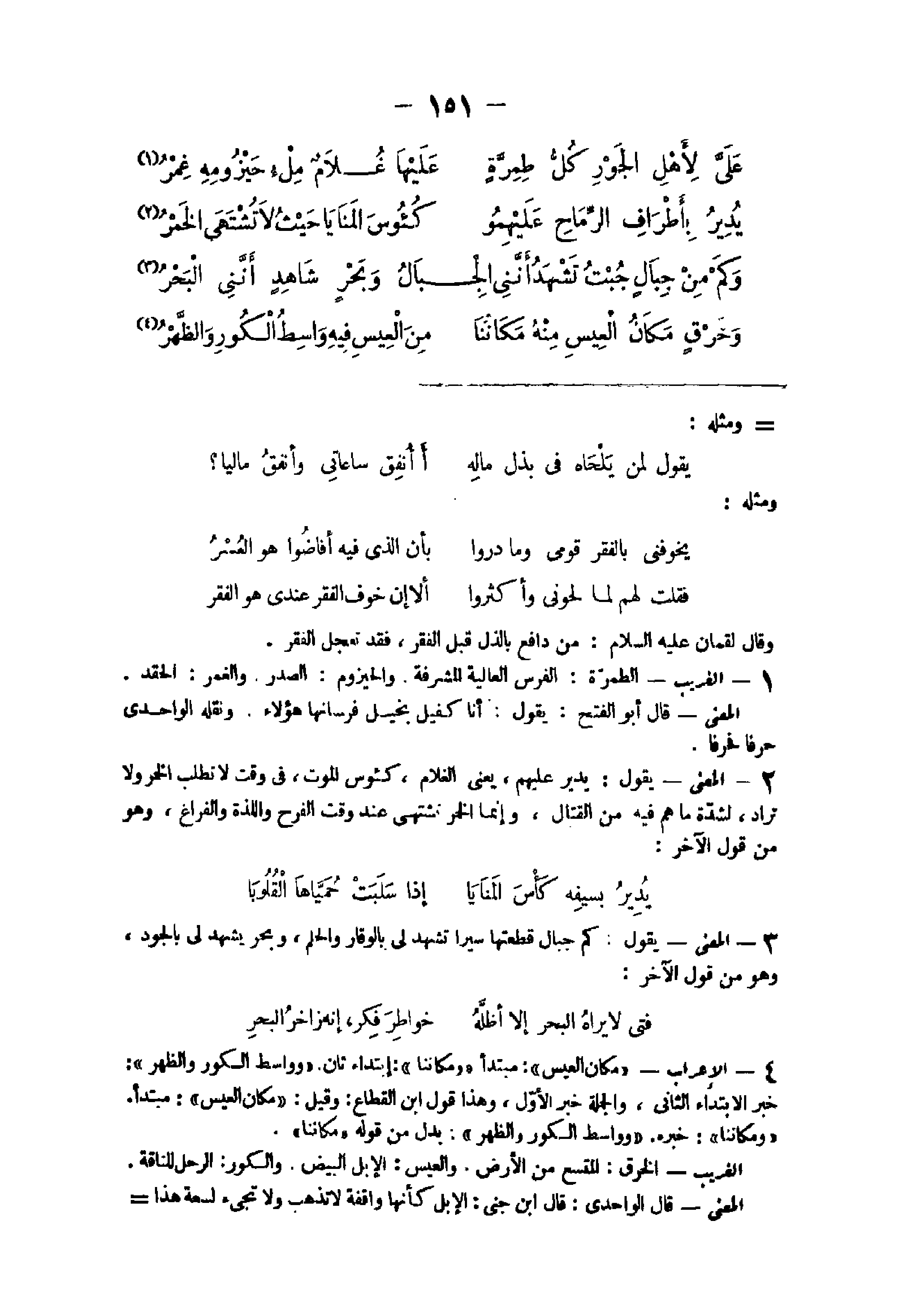 14 - الْإِعْرَاب مَكَان العيس مُبْتَدأ ومكاننا ابْتِدَاء ثانى وواسط الكور وَالظّهْر خبر الِابْتِدَاء الثانى وَالْجُمْلَة خبر الأول وَهَذَا قَول ابْن القطاع وَقيل مَكَان العيس مُبْتَدأ ومكاننا خَبره وواسط الكور وَالظّهْر بدل من قَوْله مَكَاننَا الْغَرِيب الْخرق المتسع من الأَرْض والعيس الْإِبِل الْبيض والكور الرحل للناقة الْمَعْنى قَالَ الواحدى قَالَ ابْن جنى الْإِبِل كَأَنَّهَا واقفة لَا تذْهب وَلَا تجئ لسعة هَذَا الْخرق فَكَأَنَّهَا لَيست تَبْرَح مِنْهُ فَكَمَا نَحن فى ظُهُور العيس لَا نَبْرَح مِنْهَا فى أوساط أكوارها فَكَذَلِك هى كَأَن لَهَا من أَرض هَذَا الْخرق كورا وظهرا فقد أَقَامَت بِهِ لَا تبرحه قَالَ وَقد غلط فِيمَا ذكر إِنَّمَا يصف مفازة قد توسطها فَهُوَ على ظهر الْبَعِير فى جوزه فَكَأَنَّهُ من ظهر النَّاقة مَكَانهَا من الْخرق الْمَعْنى أَنى فى وسط ظُهُور الْإِبِل وَالْإِبِل فى وسط ظهر الْخرق وَلم يتَعَرَّض فى هَذَا الْبَيْت لوقوفها وَلَا لبراحها ثمَّ ذكر سَيرهَا فى الْبَيْت الثانى فَقَالَ