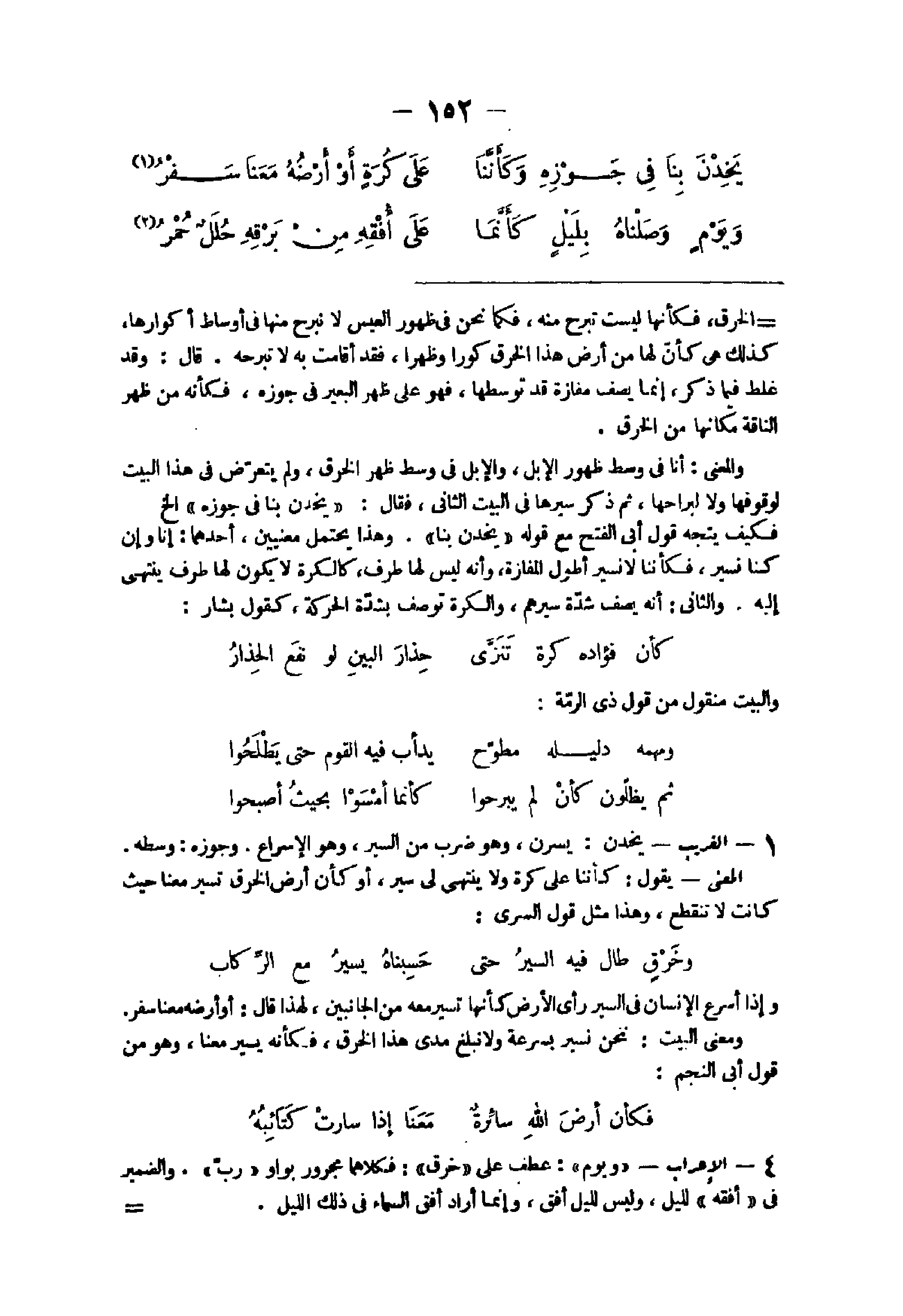 - الْغَرِيب يخدن يسرن وَهُوَ ضرب من السّير وَهُوَ الْإِسْرَاع وَجوزهُ وَسطه الْمَعْنى يَقُول كأننا على كرة وَلَا ينتهى لى سير أَو كَأَن أَرض الْخرق تسير مَعنا حَيْثُ كَانَت لَا تَنْقَطِع وَهَذَا مثل قَول السرى