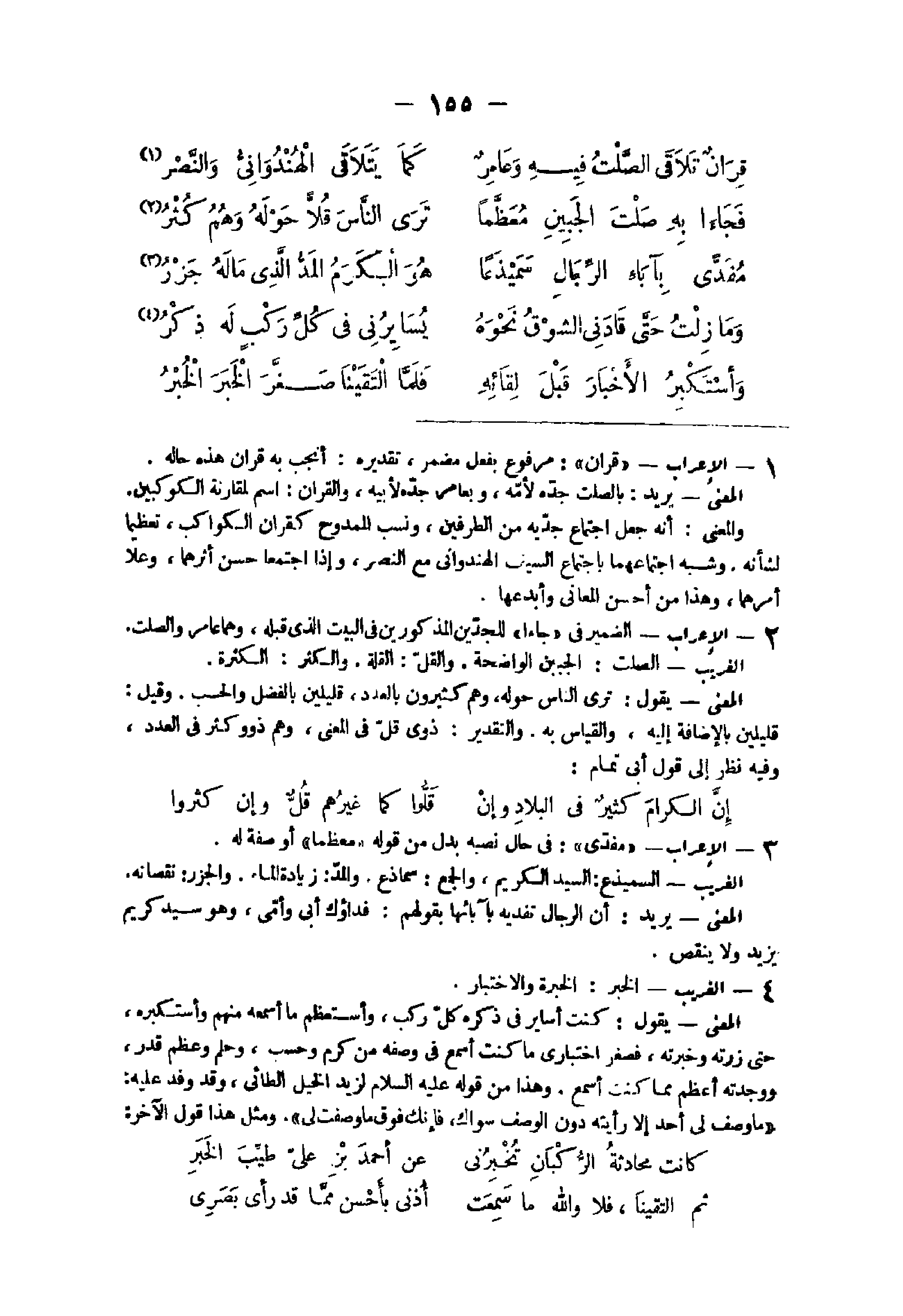 - الْإِعْرَاب قرَان مَرْفُوع بِفعل مُضْمر تَقْدِيره أَنْجَب بِهِ قرَان هَذِه حَاله الْمَعْنى يُرِيد بالصلت جده لأمه وبعامر جده لِأَبِيهِ وَالْقرَان اسْم لمقارنة الكوكبين وَالْمعْنَى أَنه جعل اجْتِمَاع جديه من الطَّرفَيْنِ وَنسب الممدوح كقران الْكَوَاكِب تَعْظِيمًا لشأنه وَشبه اجْتِمَاعهمَا باجتماع السَّيْف الهندوانى مَعَ النَّصْر وَإِذا اجْتمعَا حسن أثرهما وَعلا أَمرهمَا وَهَذَا من أحسن الْمعَانى وأبدعها