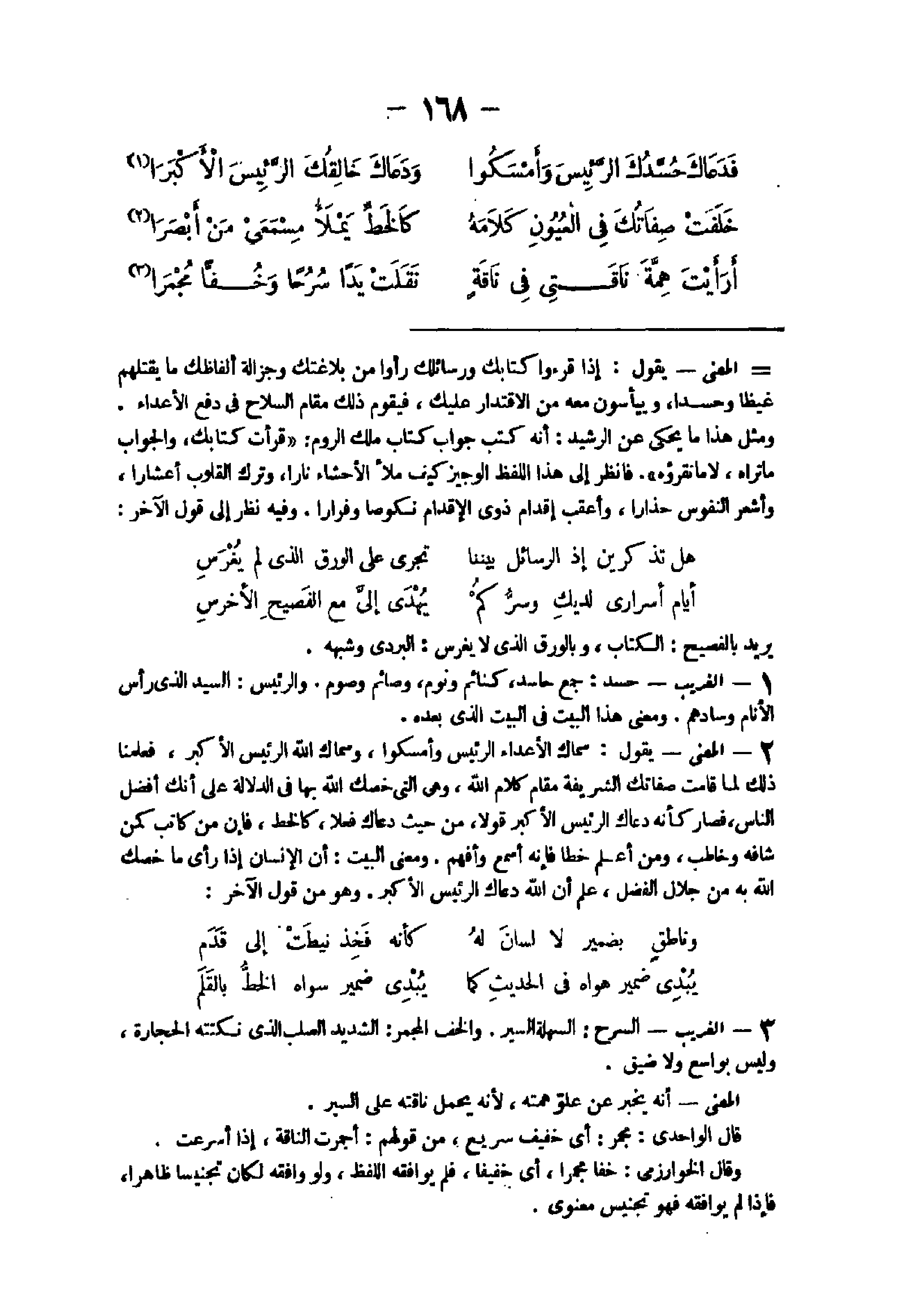 33 - الْمَعْنى يَقُول سماك الْأَعْدَاء الرئيس وأمسكوا وَسماك الله الرئيس الْأَكْبَر فَعلمنَا ذَلِك لما قَامَت صفاتك الشَّرِيفَة مقَام كَلَام الله وهى الَّتِى خصك الله بهَا فى الدّلَالَة على أَنَّك أفضل النَّاس فَصَارَ كَأَنَّهُ دعَاك الرئيس الْأَكْبَر قولا من حَيْثُ دعَاك فعلا كالخط فَإِن من كَاتب كمن شافه وخاطب وَمن أعلم خطا فَإِنَّهُ أسمع وَأفهم وَمعنى الْبَيْت أَن الْإِنْسَان إِذا رأى مَا خصك الله بِهِ من جلال الْفضل علم أَن الله دعَاك الرئيس الْأَكْبَر وَهُوَ من قَول الآخر
