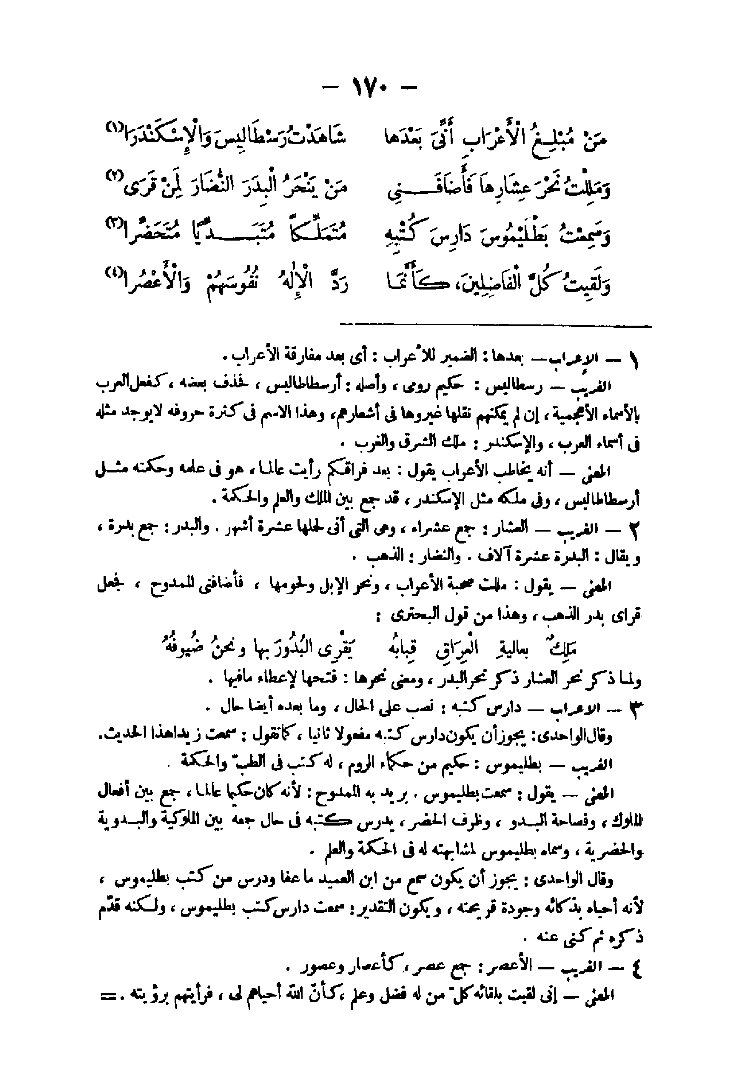 - الْإِعْرَاب بعْدهَا الضَّمِير للأعراب أى بعد مُفَارقَة الْأَعْرَاب الْغَرِيب رسطاليس حَكِيم رومى وَأَصله أرسطاطاليس فَحذف بعضه كَفعل الْعَرَب بالأسماء الأعجمية إِن لم يُمكنهُم نقلهَا غيروها فى أشعارهم وَهَذَا الِاسْم فى كَثْرَة حُرُوفه لَا يُوجد مثله فى أَسمَاء الْعَرَب والإسكندر ملك الشرق والغرب الْمَعْنى أَنه يُخَاطب الْأَعْرَاب يَقُول بعد فراقكم رَأَيْت عَالما وَهُوَ فى علمه وحكمته مثل أرسطاطاليس وفى ملكه مثل الْإِسْكَنْدَر قد جمع بَين الْملك وَالْعلم وَالْحكمَة