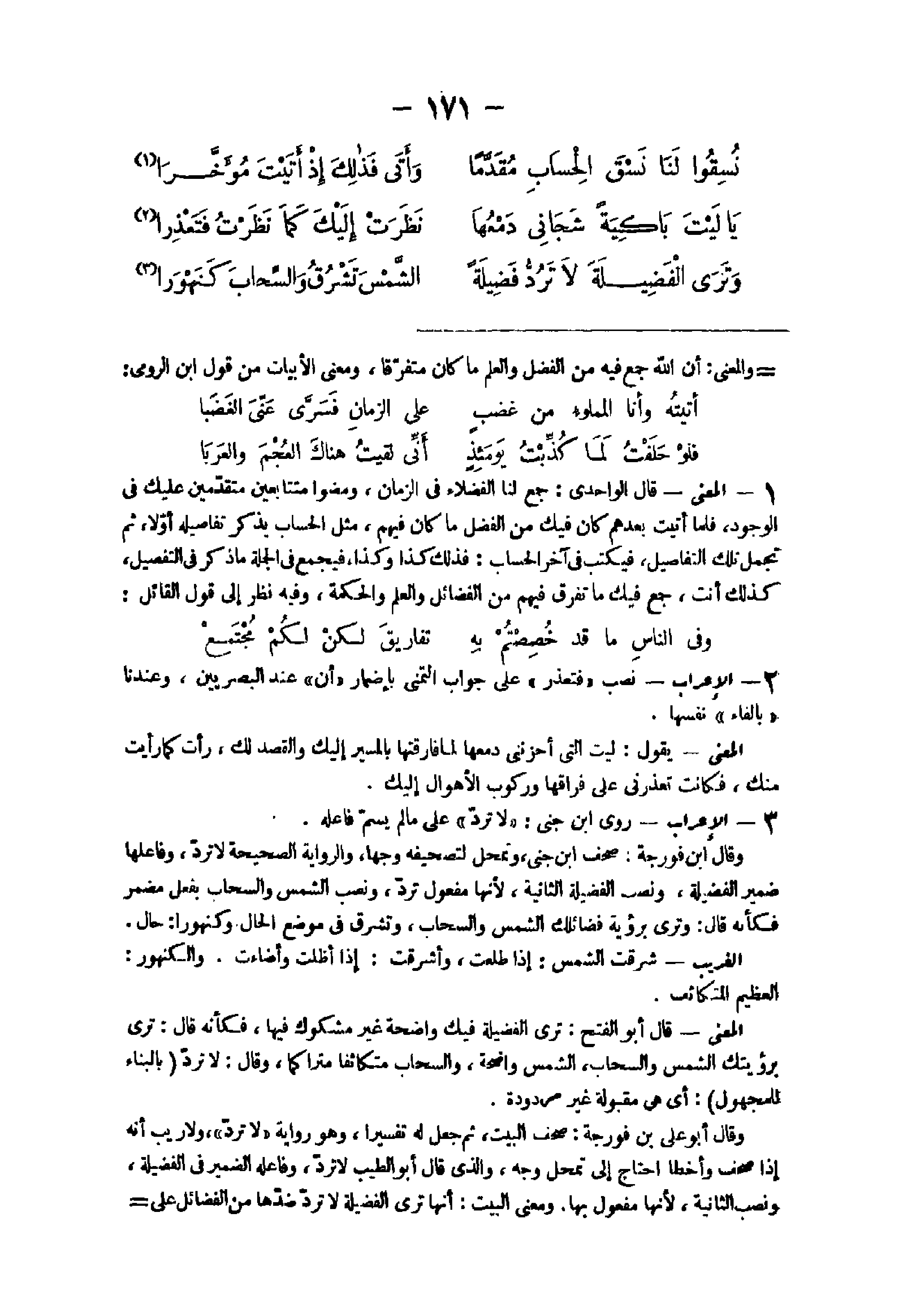 44 - الْإِعْرَاب نصب فَتعذر على جَوَاب التمنى بإضمار أَن عِنْد الْبَصرِيين وَعِنْدنَا بِالْفَاءِ نَفسهَا الْمَعْنى يَقُول لَيْت الَّتِى أحزننى دمعها لما فارقتها بِالْمَسِيرِ إِلَيْك وَالْقَصْد لَك رَأَتْ كَمَا رَأَيْت مِنْك فَكَانَت تعذرنى على فراقها وركوب الْأَهْوَال إِلَيْك 45 - الْإِعْرَاب روى ابْن جنى لَا ترد على مَا لم يسم فَاعله وَقَالَ ابْن فورجة صحف ابْن جنى وتمحل لتصحيفه وَجها وَالرِّوَايَة الصَّحِيحَة لَا ترد وفاعلها ضمير الْفَضِيلَة وَنصب الْفَضِيلَة الثَّانِيَة لِأَنَّهَا مفعول ترد وَنصب الشَّمْس والسحاب بِفعل مُضْمر فَكَأَنَّهُ قَالَ وَترى بِرُؤْيَة فضائلك الشَّمْس والسحاب وتشرق فى مَوضِع الْحَال وكنهورا حَال الْغَرِيب شَرقَتْ الشَّمْس إِذا طلعت وأشرقت إِذا أظلت وأضاءت والكنهور الْعَظِيم المتكاثف الْمَعْنى قَالَ أَبُو الْفَتْح ترى الْفَضِيلَة فِيك وَاضِحَة غير مَشْكُوك فِيهَا فَكَأَنَّهُ قَالَ ترى برؤيتك الشَّمْس والسحاب وَالشَّمْس وَاضِحَة والسحاب متكاثفا متراكما وَقَالَ لَا ترد بِالْبِنَاءِ للْمَجْهُول أى هى مَقْبُولَة غير مَرْدُودَة وَقَالَ أَبُو على بن فورجة صحف الْبَيْت ثمَّ جعل لَهُ تَفْسِيرا وَهُوَ رِوَايَة لَا ترد وَلَا ريب أَنه إِذا صحف وَأَخْطَأ احْتَاجَ إِلَى تمحل وَجه والذى قَالَ أَبُو الطّيب لَا ترد وفاعله الضَّمِير فى الْفَضِيلَة وَنصب الثَّانِيَة لِأَنَّهَا مفعول بهَا وَمعنى الْبَيْت أَنَّهَا ترى الْفَضِيلَة لَا ترد ضدها من الْفَضَائِل على مَا عهدنا من المتضادين ثمَّ فسر ذَلِك فَقَالَ يوجدك الشَّمْس مشرقة والسحاب كنهورا فى حَال وَاحِد أى يوجدك هَذَا الممدوح هَذِه المتضادين وَإِن كَانَت الشَّمْس يَسْتُرهَا السَّحَاب فوجهه كَالشَّمْسِ إضاءة ونائلة كالسحاب الكنهور فعلى تضادهما لَا يتنافيان فى وَقت وَاحِد وَلَو كَانَا فى الْحَقِيقَة الشَّمْس والسحاب لستر السَّحَاب الشَّمْس وتنافيا وَقد قَالَ فى مَعْنَاهُ مُحَمَّد بن على بن بسام