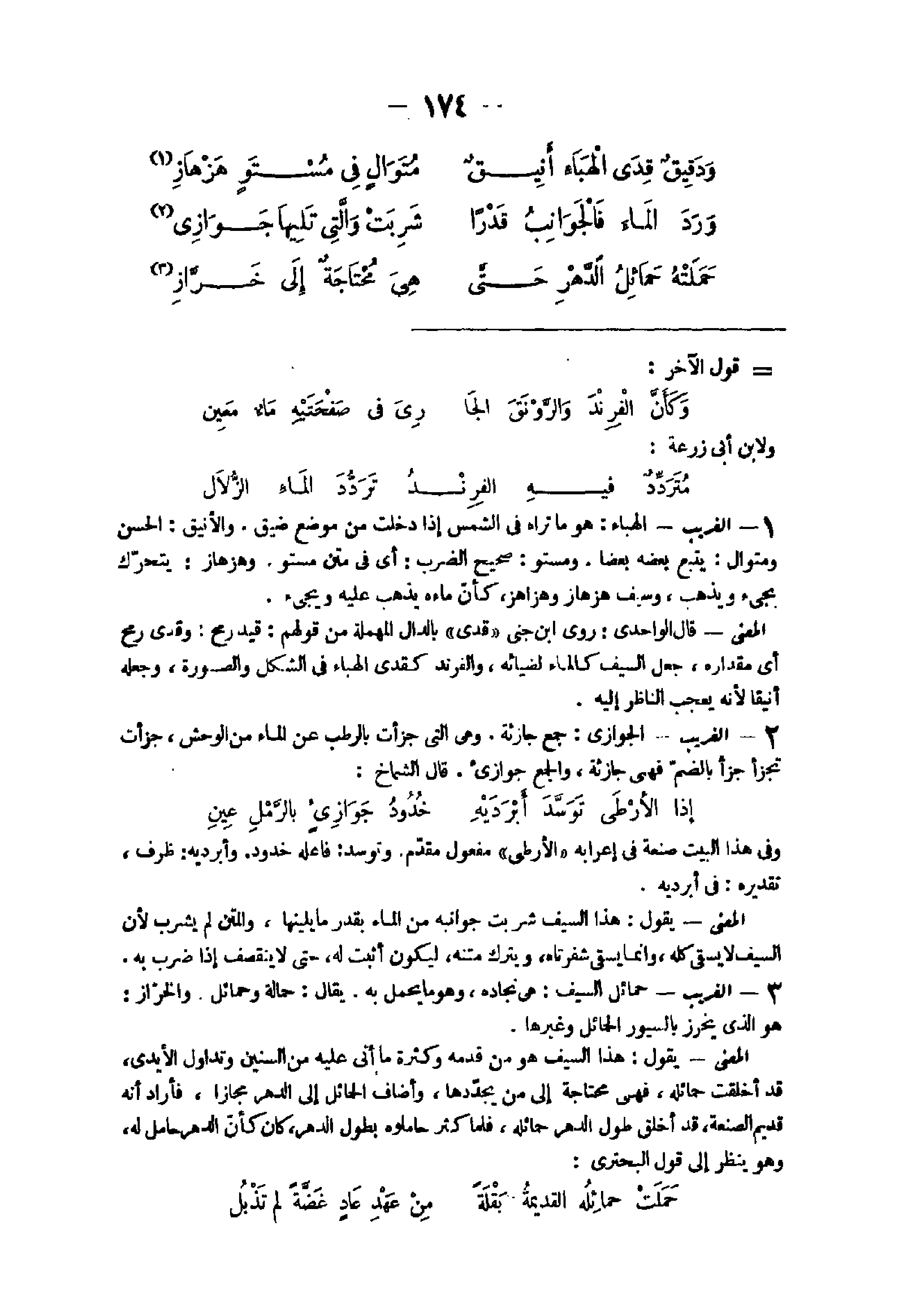 - الْغَرِيب الهباء هُوَ مَا ترَاهُ فى الشَّمْس إِذا دخلت من مَوضِع ضيق والأنيق الْحسن ومتوال يتبع بعضه بَعْضًا ومستو صَحِيح الضَّرْب أى فى متن مستو وهزهاز يَتَحَرَّك يجِئ وَيذْهب وَسيف هزهاز وهزاهز كَأَن مَاءَهُ يذهب عَلَيْهِ ويجئ الْمَعْنى قَالَ الواحدى روى ابْن جنى قدى بِالدَّال الْمُهْملَة من قَوْلهم قيد رمح وقدى رمح أى مِقْدَاره جعل السَّيْف كَالْمَاءِ لضيائه والفرند كقدى الهباء فى الشكل وَالصُّورَة وَجعله أنيقا لِأَنَّهُ يعجب النَّاظر إِلَيْهِ