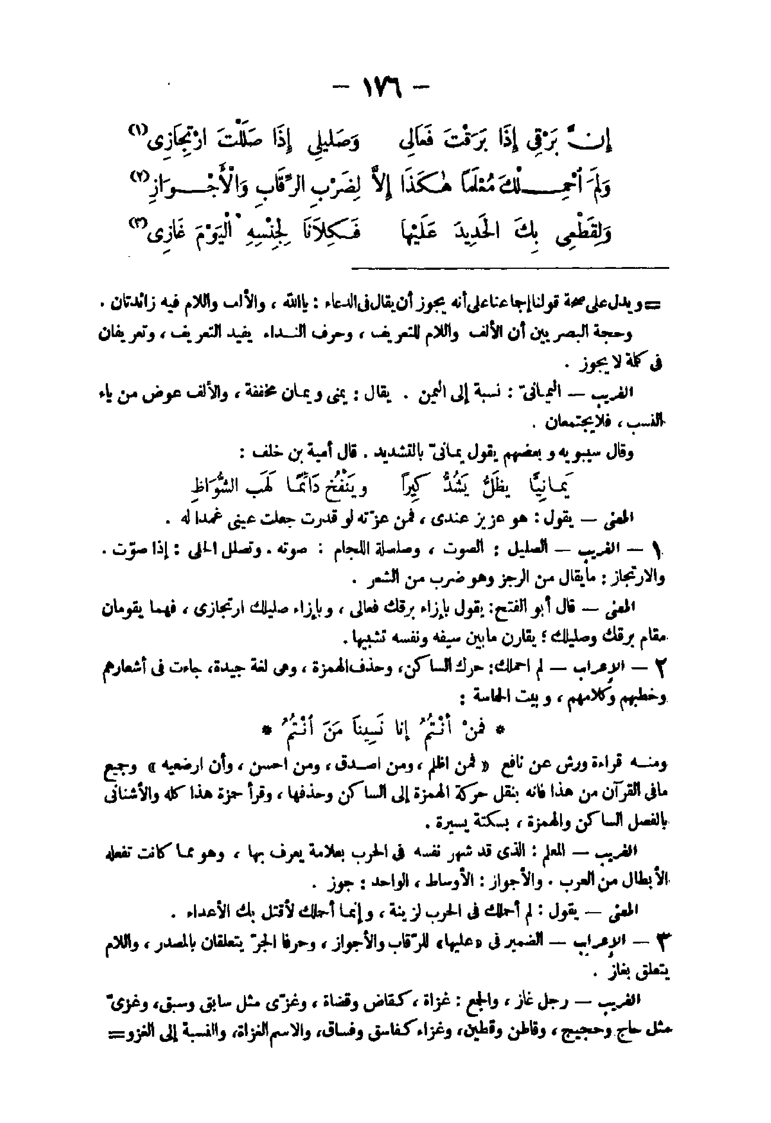 12 - الْإِعْرَاب الضَّمِير فى عَلَيْهَا للرقاب والأجواز وحرفا الْجَرّ يتعلقان بِالْمَصْدَرِ وَاللَّام يتَعَلَّق بغاز الْغَرِيب رجل غاز وَالْجمع غزَاة كقاض وقضاة وغزى مثل سَابق وَسبق وغزى مثل حَاج وحجيج وقاطن وقطين وغزاء كفاسق وفساق وَالِاسْم الْغُزَاة وَالنِّسْبَة إِلَى الْغَزْو غزوى وَكله الذى يَغْزُو الْعَدو وَأَصله الْقَصْد الْمَعْنى يَقُول لم أحملك إِلَّا لقطعى بك الدروع والمغافر فَأَنا أعزو جنسى من النَّاس وَأَنت تغزو جنسك من الْحَدِيد فكلانا يَغْزُو جنسه