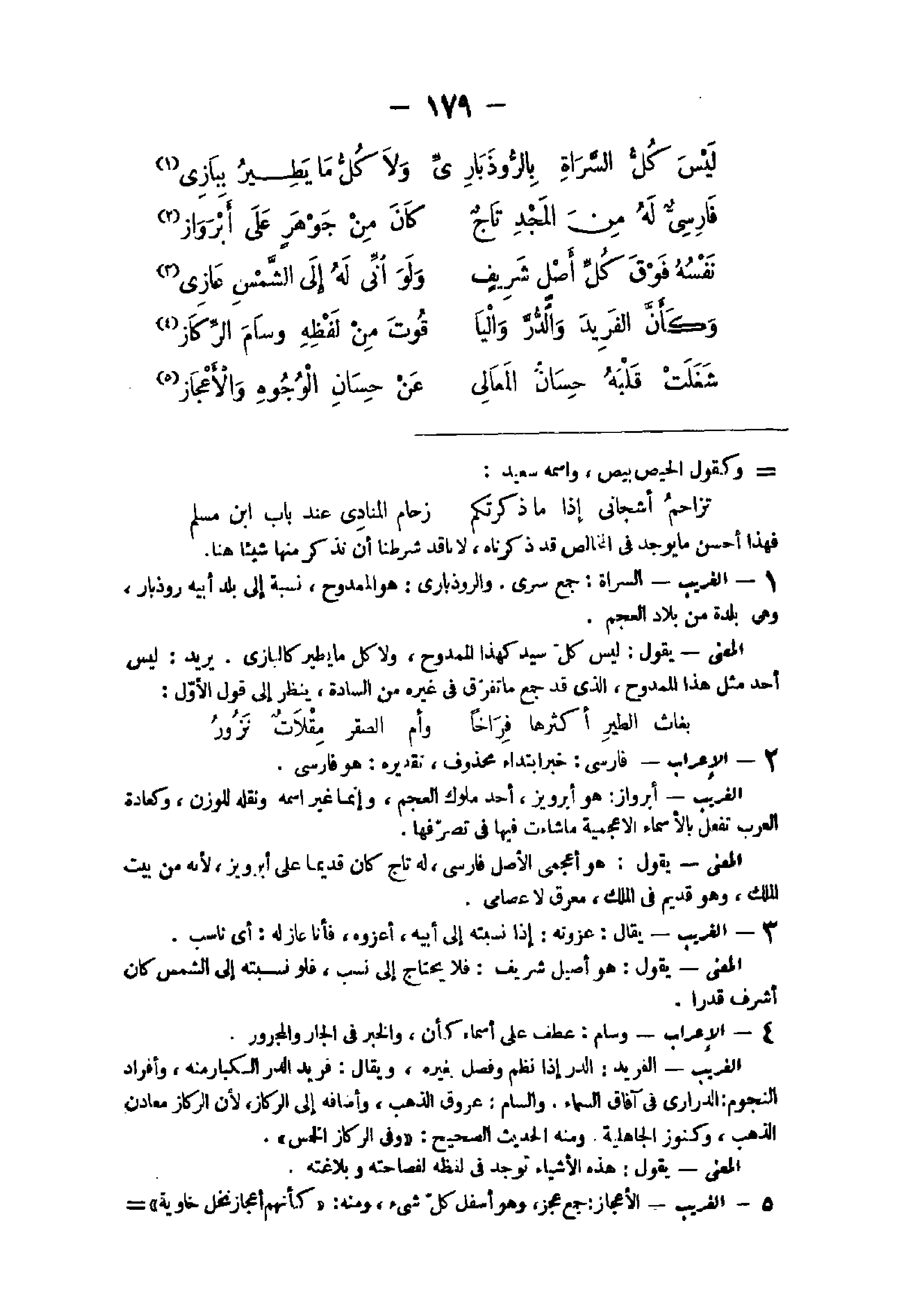 - الْغَرِيب السراة جمع سرى والروذبارى هُوَ الممدوح نِسْبَة إِلَى بلد أَبِيه روذبار وهى بَلْدَة من بِلَاد الْعَجم الْمَعْنى يَقُول لَيْسَ كل سيد كَهَذا الممدوح وَلَا كل مَا يطير كالبازى يُرِيد لَيْسَ أحد مثل هَذَا الممدوح الذى قد جمع مَا تفرق فى غَيره من السَّادة ينظر إِلَى قَول الأول