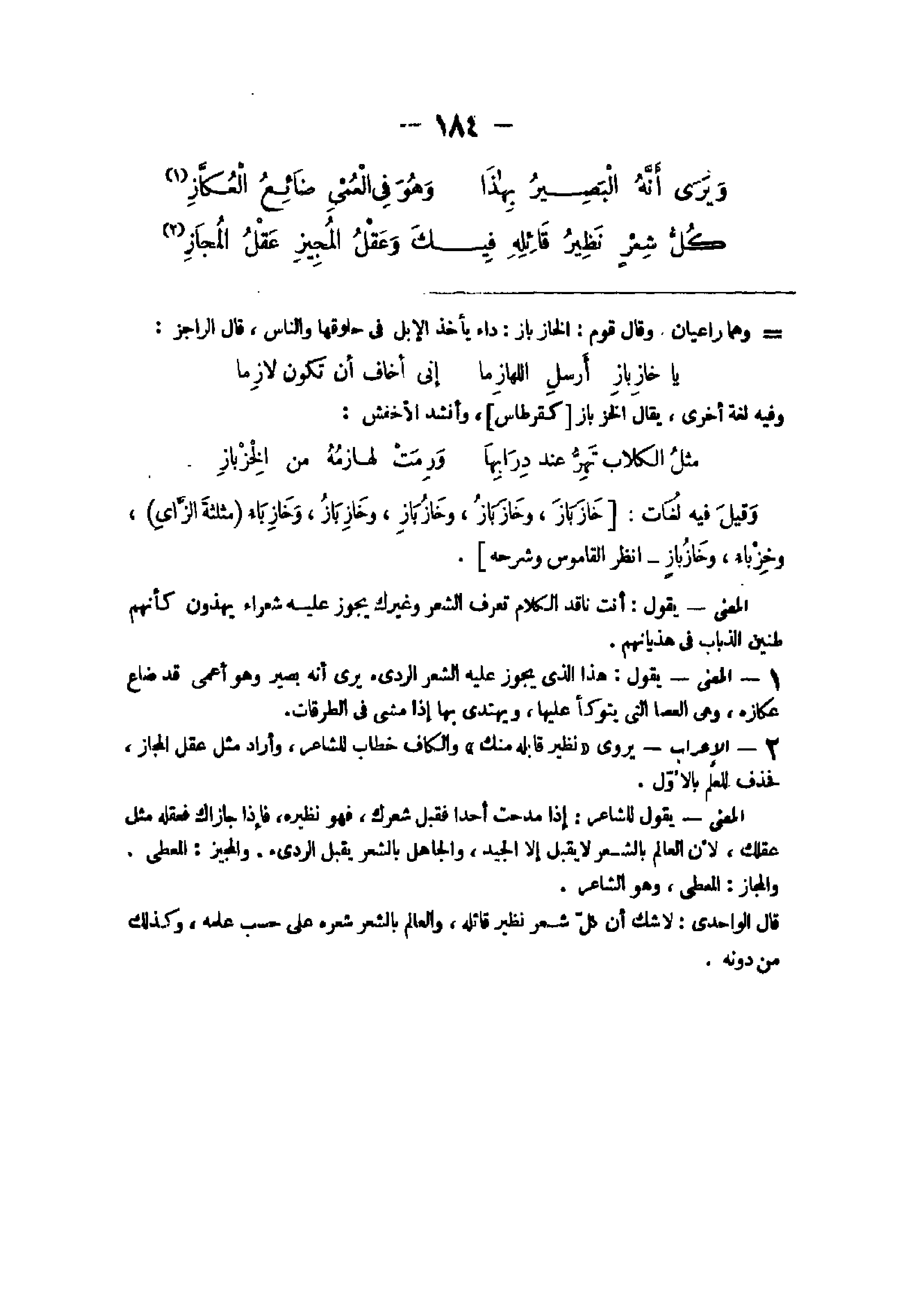 - الْمَعْنى يَقُول هَذَا الذى يجوز عَلَيْهِ الشّعْر الردئ يرى أَنه بَصِير وَهُوَ أعمى قد ضَاعَ عكازه وهى الْعَصَا الَّتِى يتَوَكَّأ عَلَيْهَا ويهتدى بهَا إِذا مَشى فى الطرقات