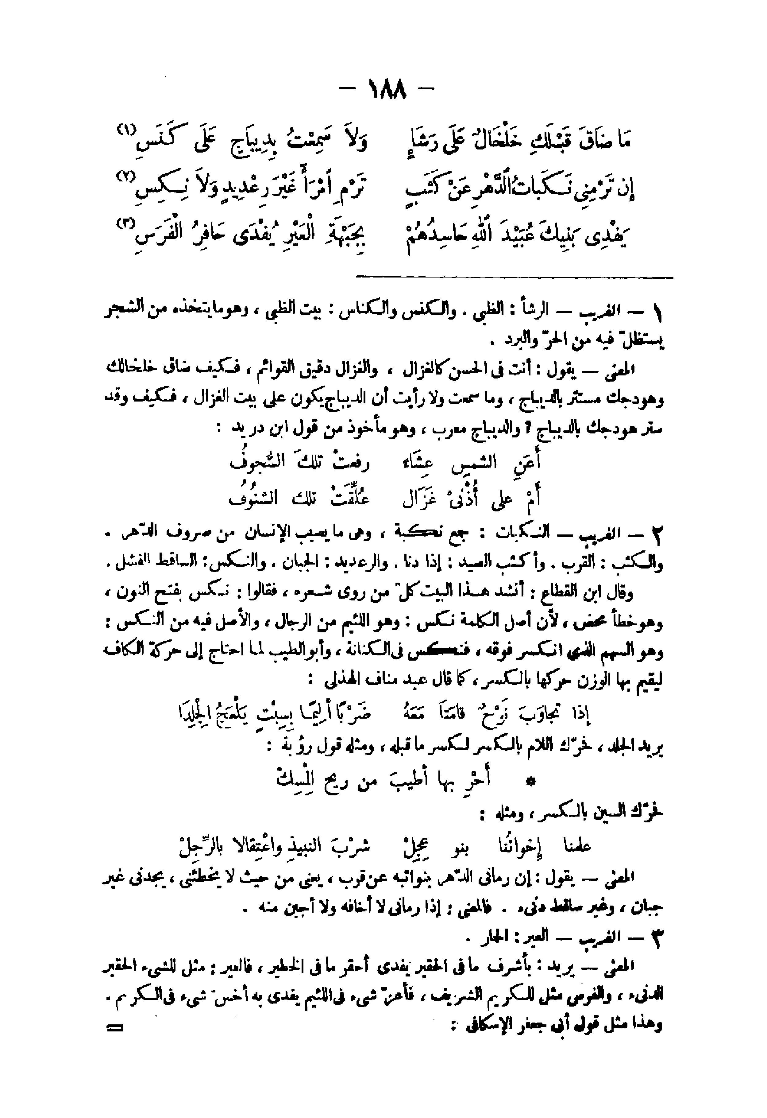 - الْغَرِيب الرشأ الظبى والكنس والكناس بَيت الظبى وَهُوَ مَا يَتَّخِذهُ من الشّجر يستظل فِيهِ من الْحر وَالْبرد الْمَعْنى يَقُول أَنْت فى الْحسن كالغزال والغزال دَقِيق القوائم فَكيف ضَاقَ خلخالك وَهُوَ دجك مستتر بالديباج وَمَا سَمِعت وَلَا رَأَيْت أَن الديباج يكون على بَيت الغزال فَكيف وَقد ستر هودجك بالديباج والديباج مُعرب وَهُوَ مَأْخُوذ من قَول ابْن دُرَيْد